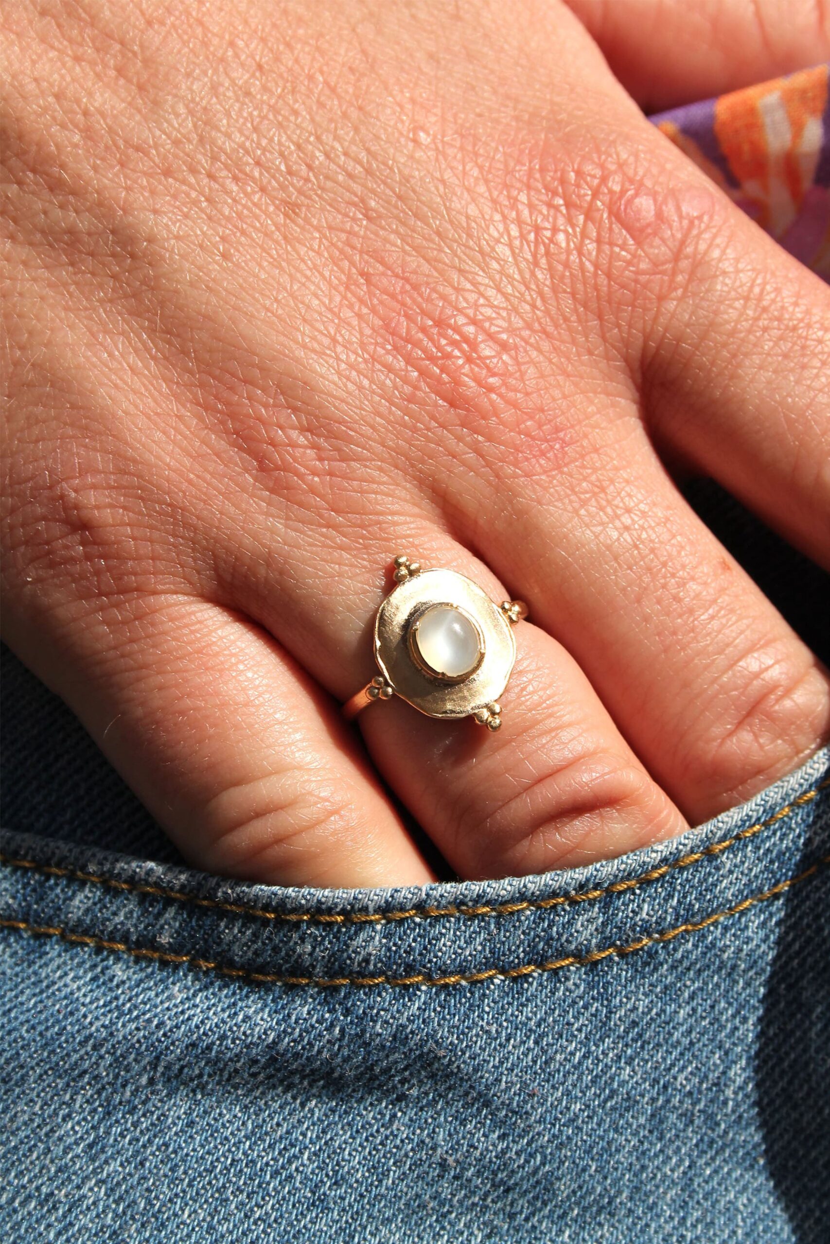 Une ravissante bague à l’allure résolument vintage, où l’or brossé à l’effet mat contraste avec la note de pierre de lune.