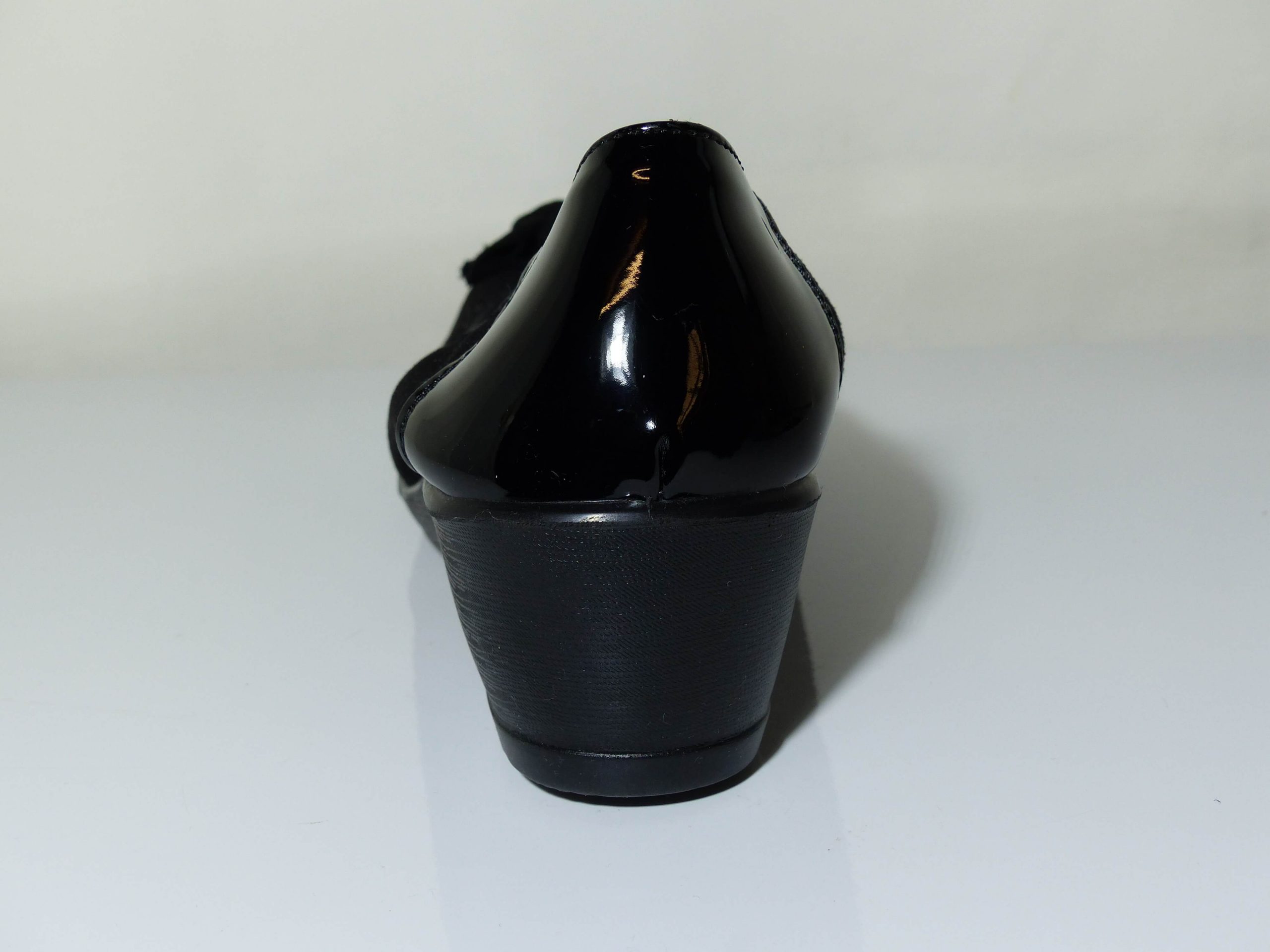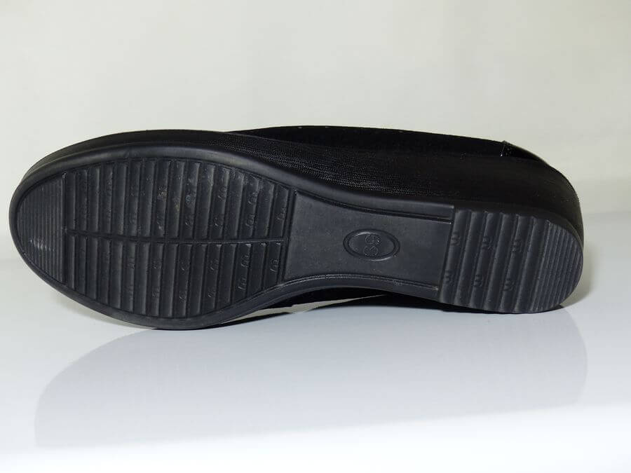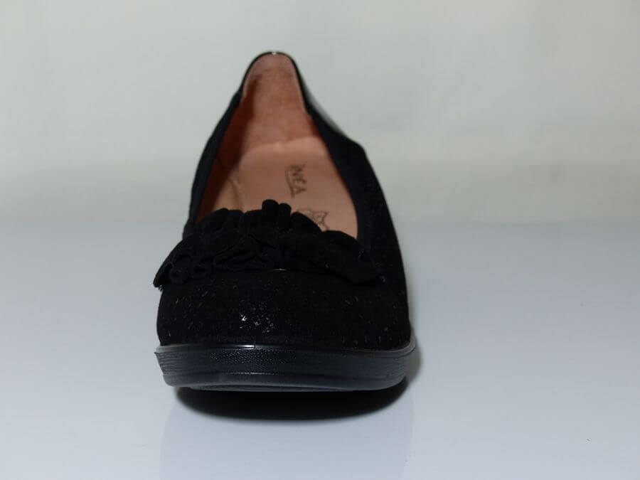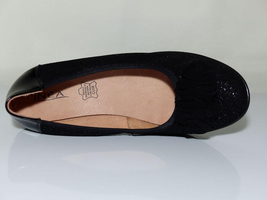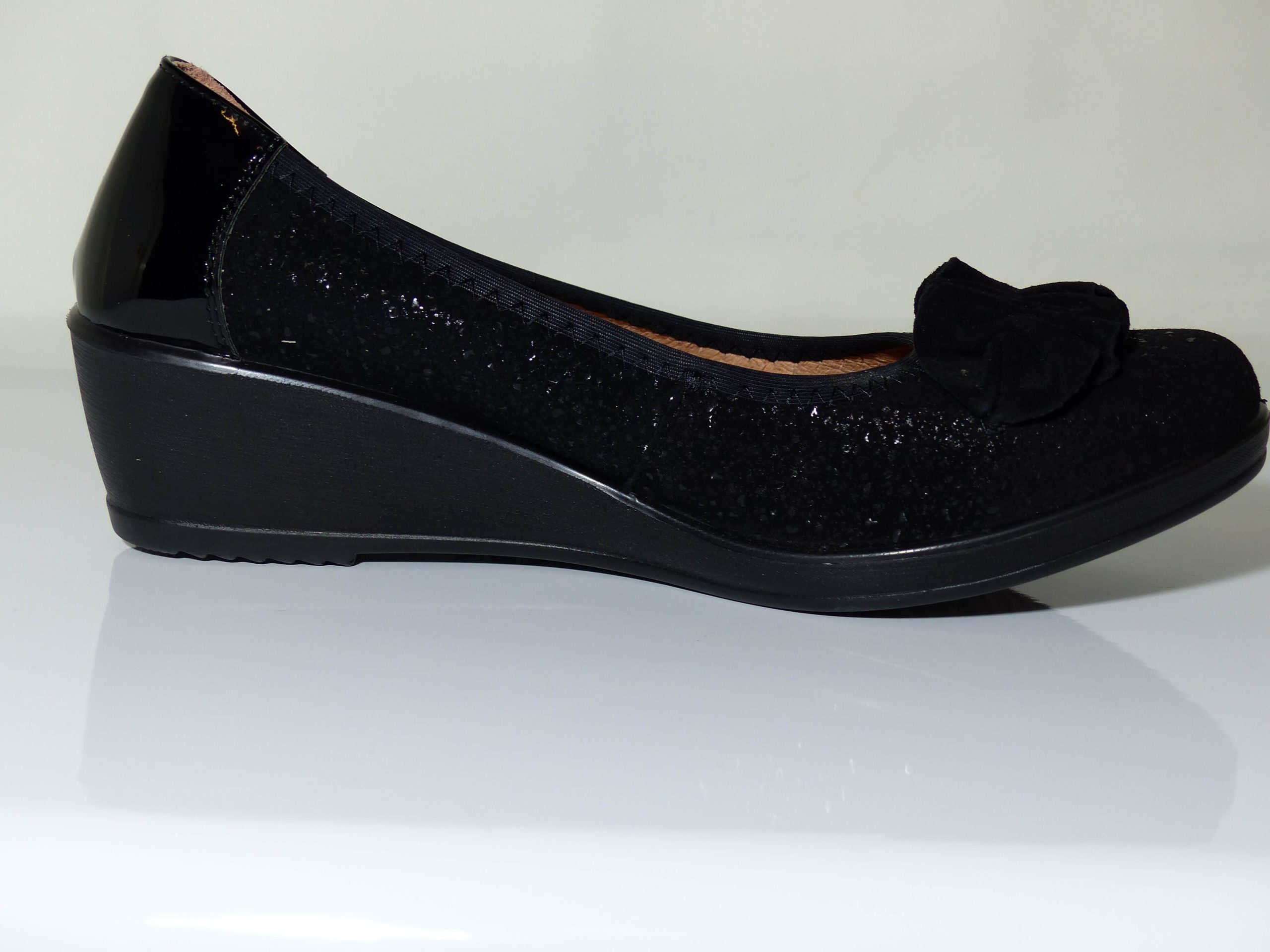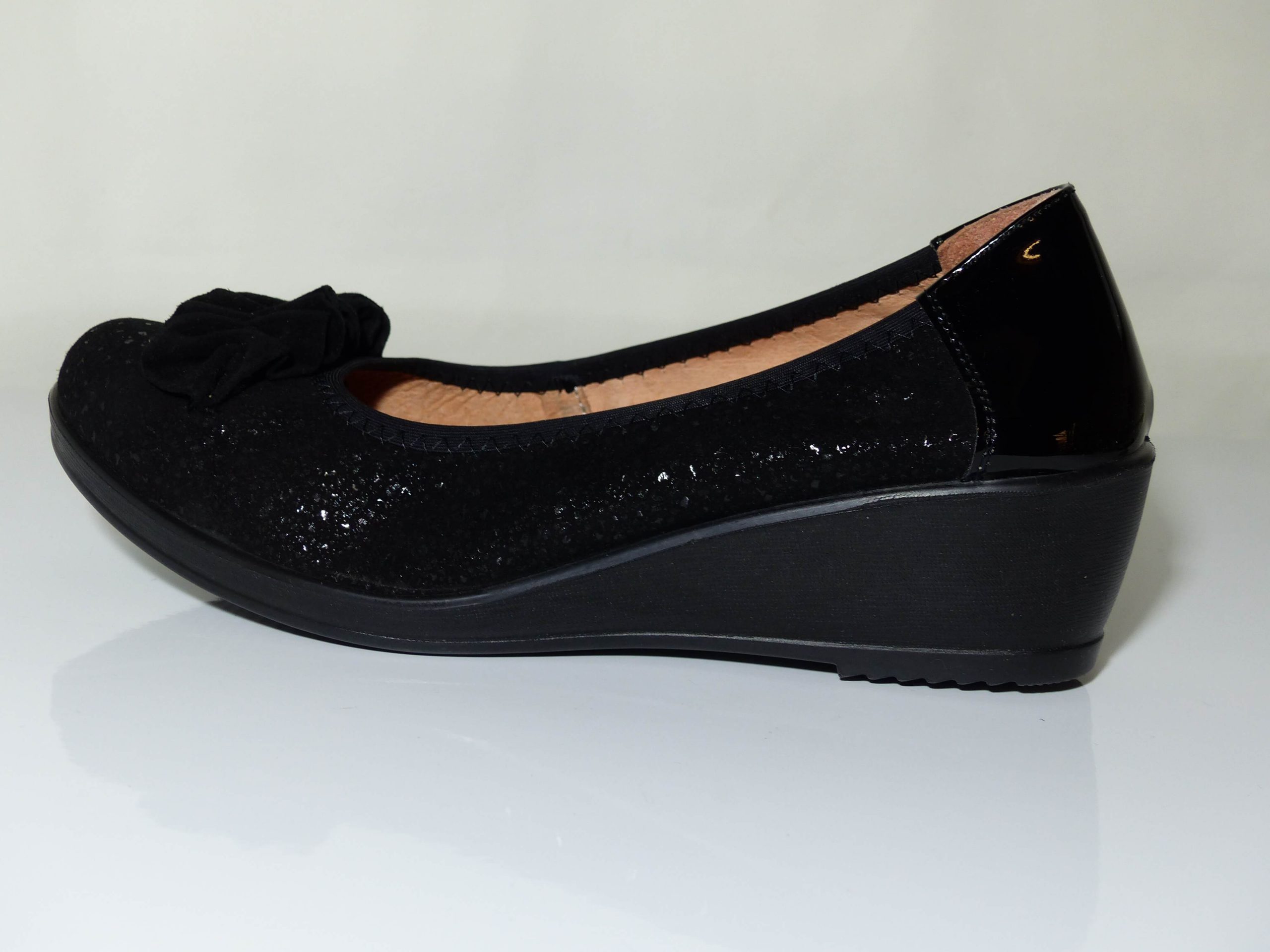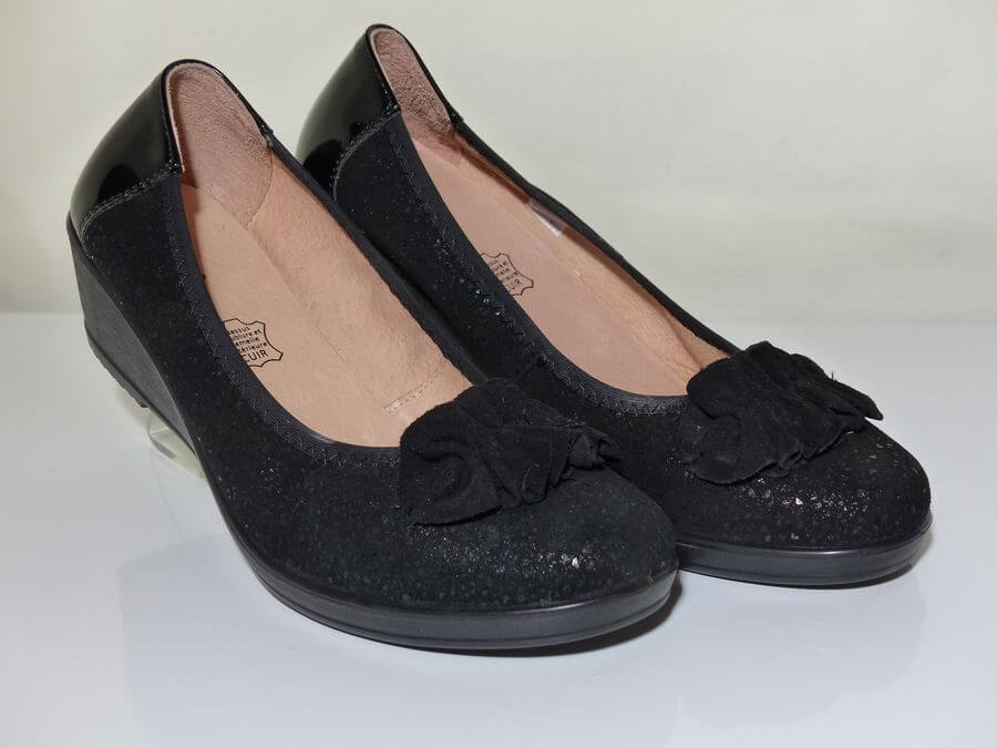 Cette ballerine compensée vous séduira par son confort qui n’est plus à prouver. On aime ce décolleté très confortable grâce à son élastique et talon en vernis noir. On aime aussi sa semelle intérieure cuir sur un support de mousse latex. La semelle extérieure compensée est en élastomère. Le dessus est parsemé de paillettes et agrémenté d’un nœud en velours noir.