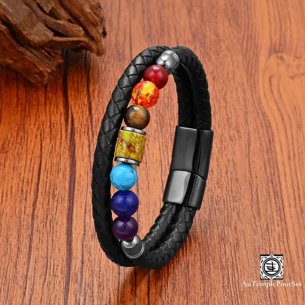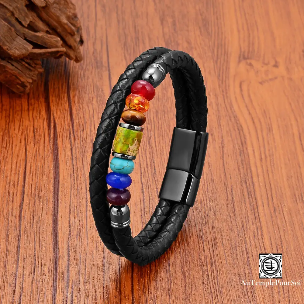 Harmonisez votre énergie avec ce bracelet 7 chakras en cuir tressé, orné de perles en pierres naturelles soigneusement sélectionnées pour équilibrer corps et esprit.