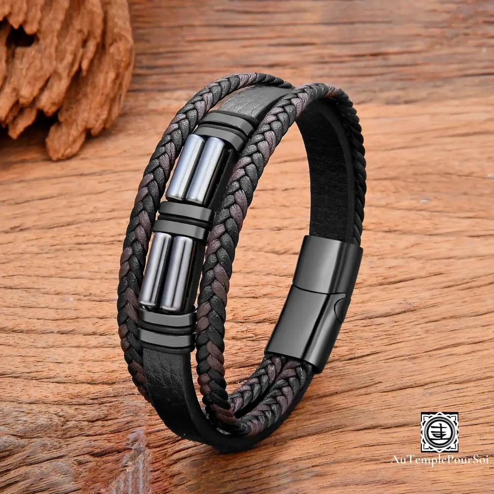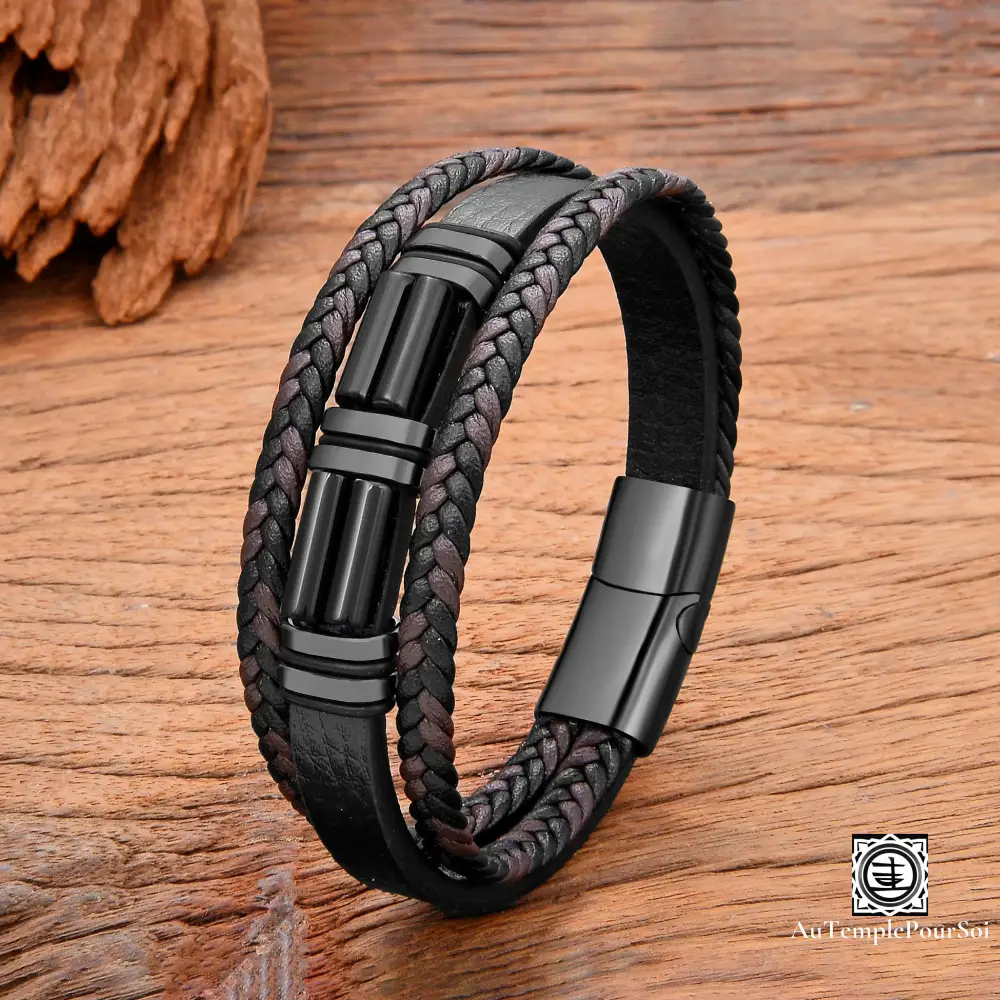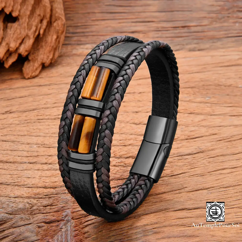 Découvrez ce bracelet en cuir tressé, agrémenté de pierres naturelles soigneusement sélectionnées pour leurs vertus énergétiques et leur raffinement.