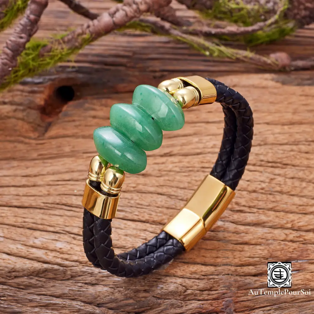 Affirmez votre style avec ce bracelet en cuir tressé double rang, rehaussé de pierres naturelles et d’éléments en acier inoxydable.