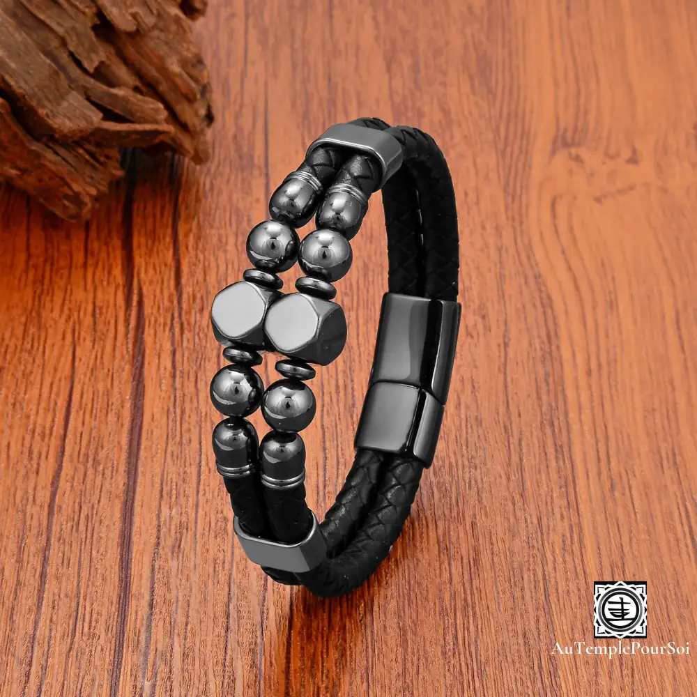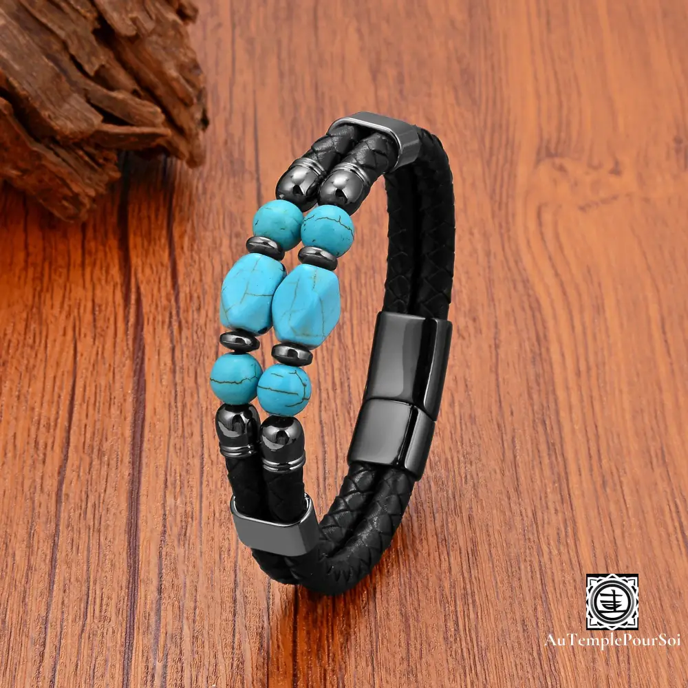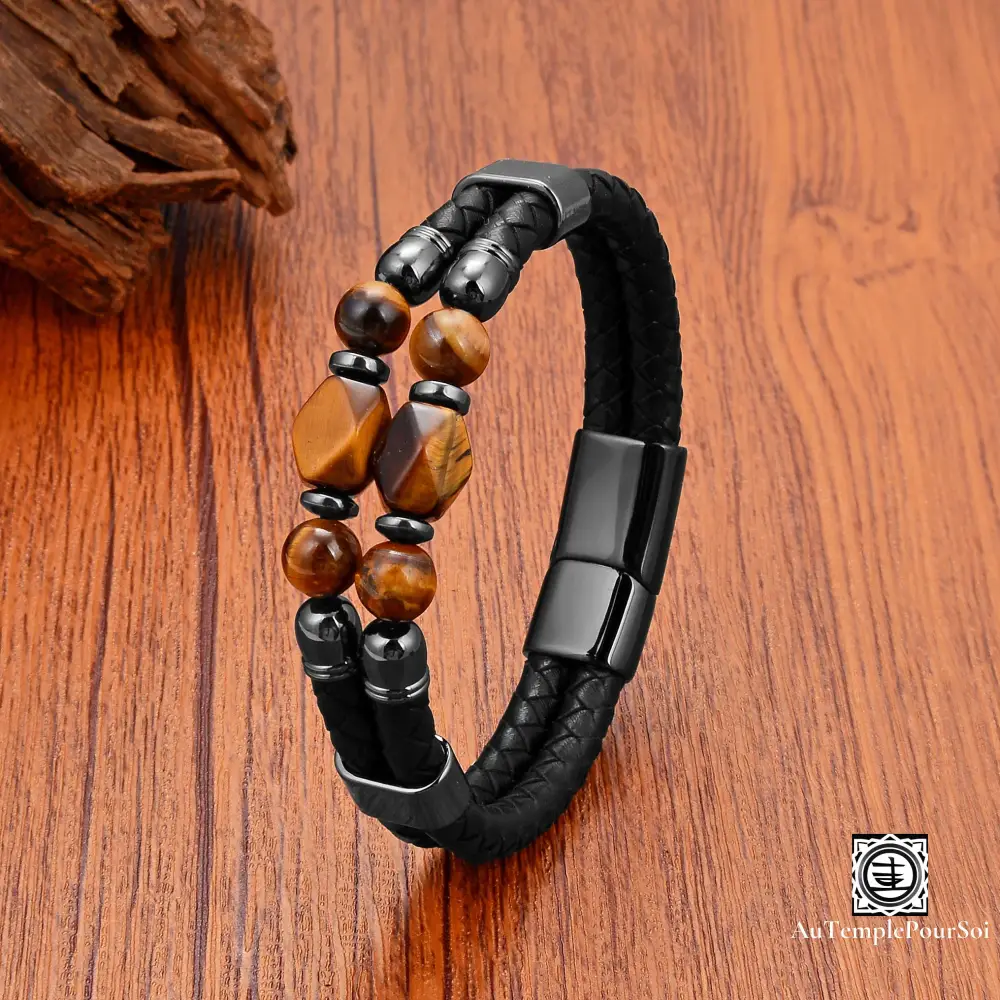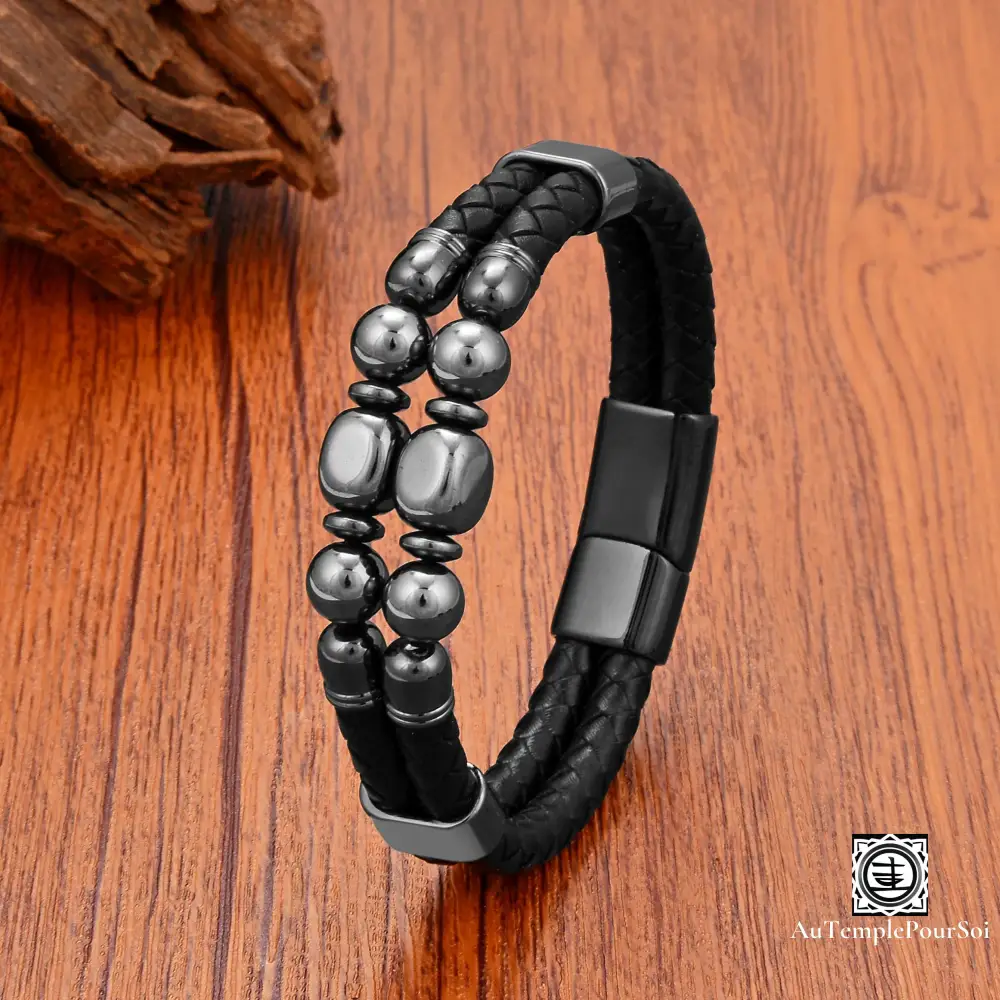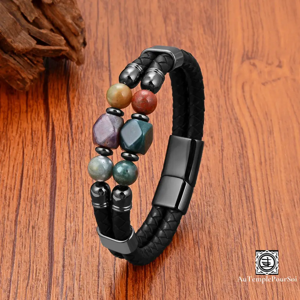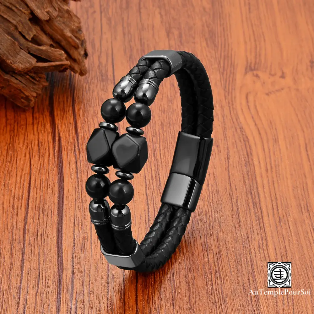 Affirmez votre style avec ce bracelet en cuir tressé noir, sublimé par des perles en pierre naturelle soigneusement sélectionnées pour leurs propriétés énergétiques.