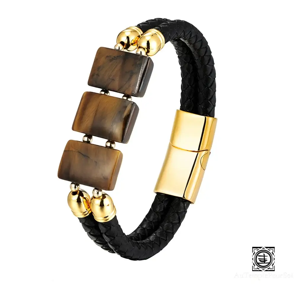 Affirmez votre style avec ce bracelet en cuir tressé multi-couches, sublimé par trois pierres naturelles d’Œil de Tigre rectangulaires et des finitions en acier inoxydable doré.