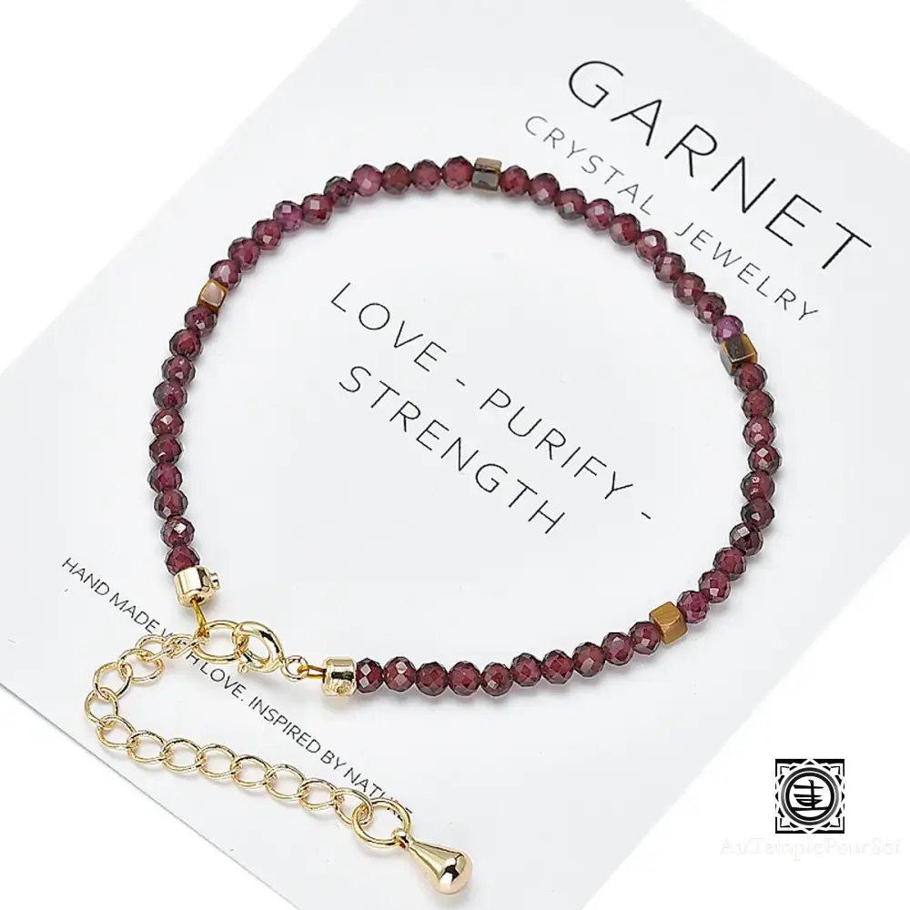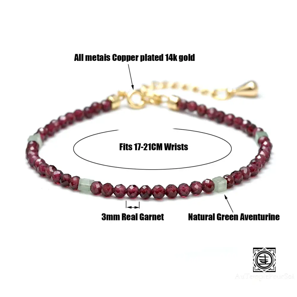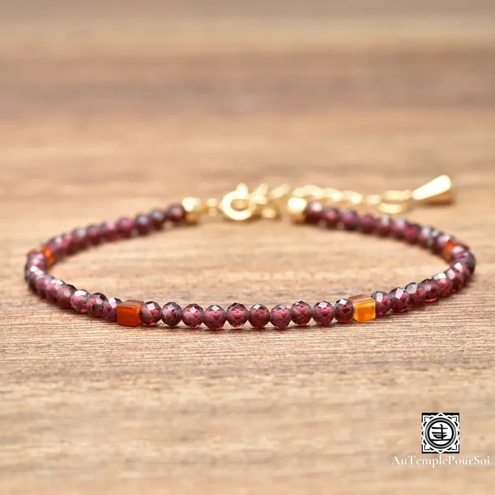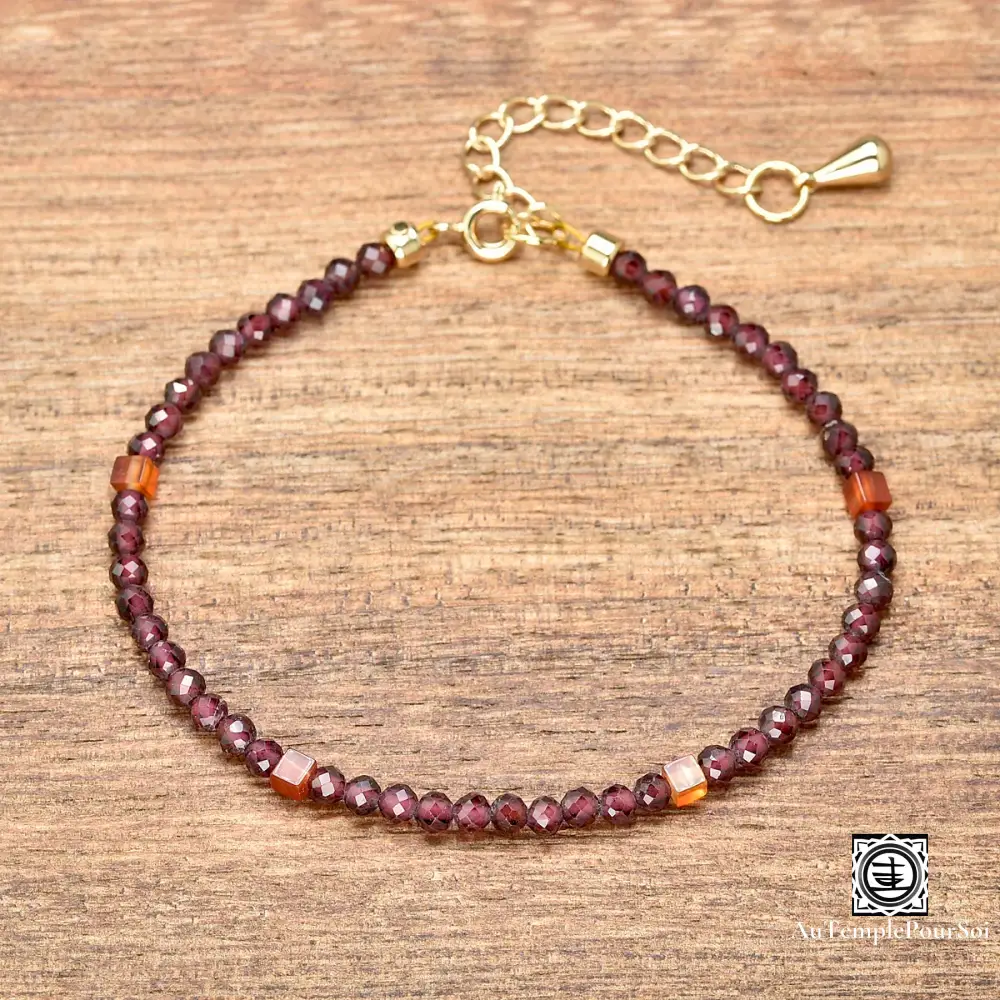 Ajoutez une touche de raffinement et d’énergie positive à votre style avec ce bracelet en grenat rouge naturel et cornaline, rehaussé d’un délicat plaquage en or 14k.