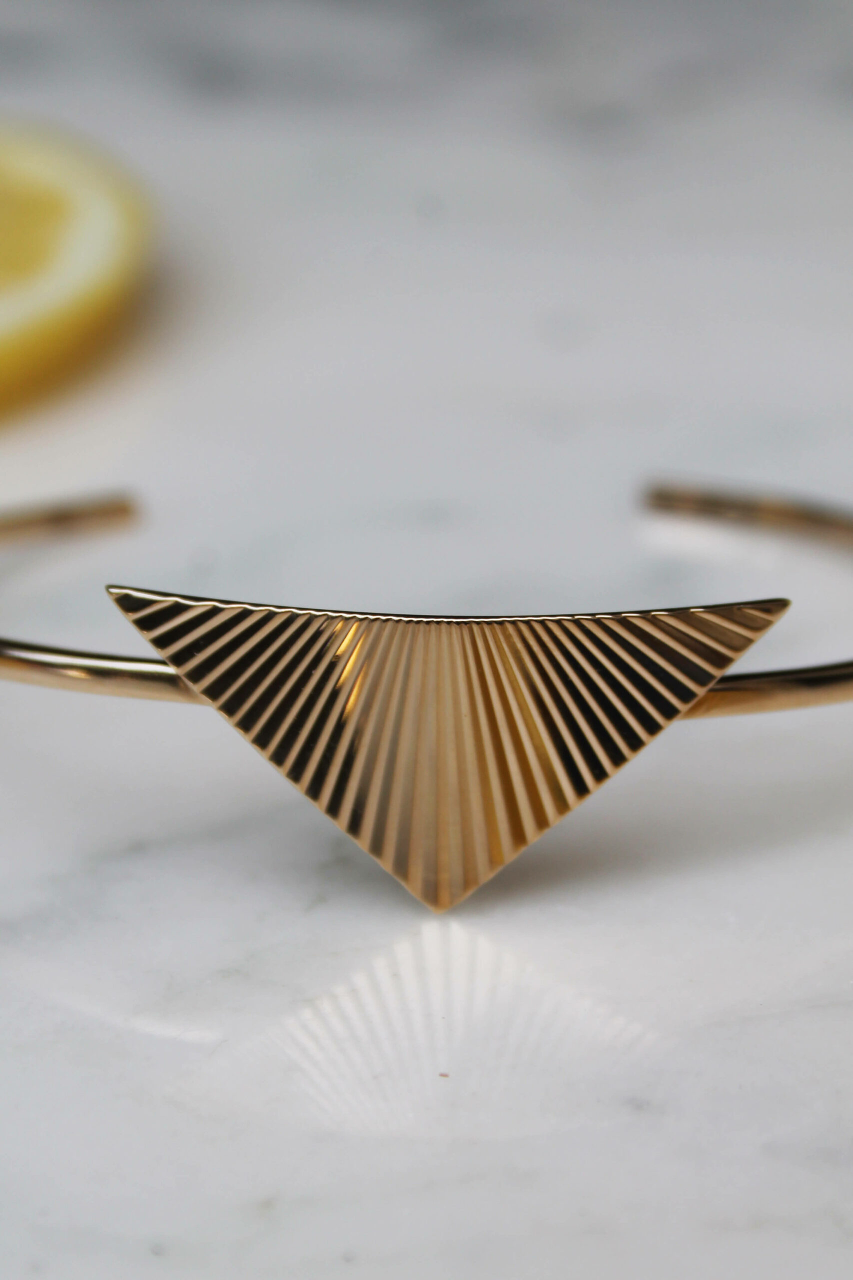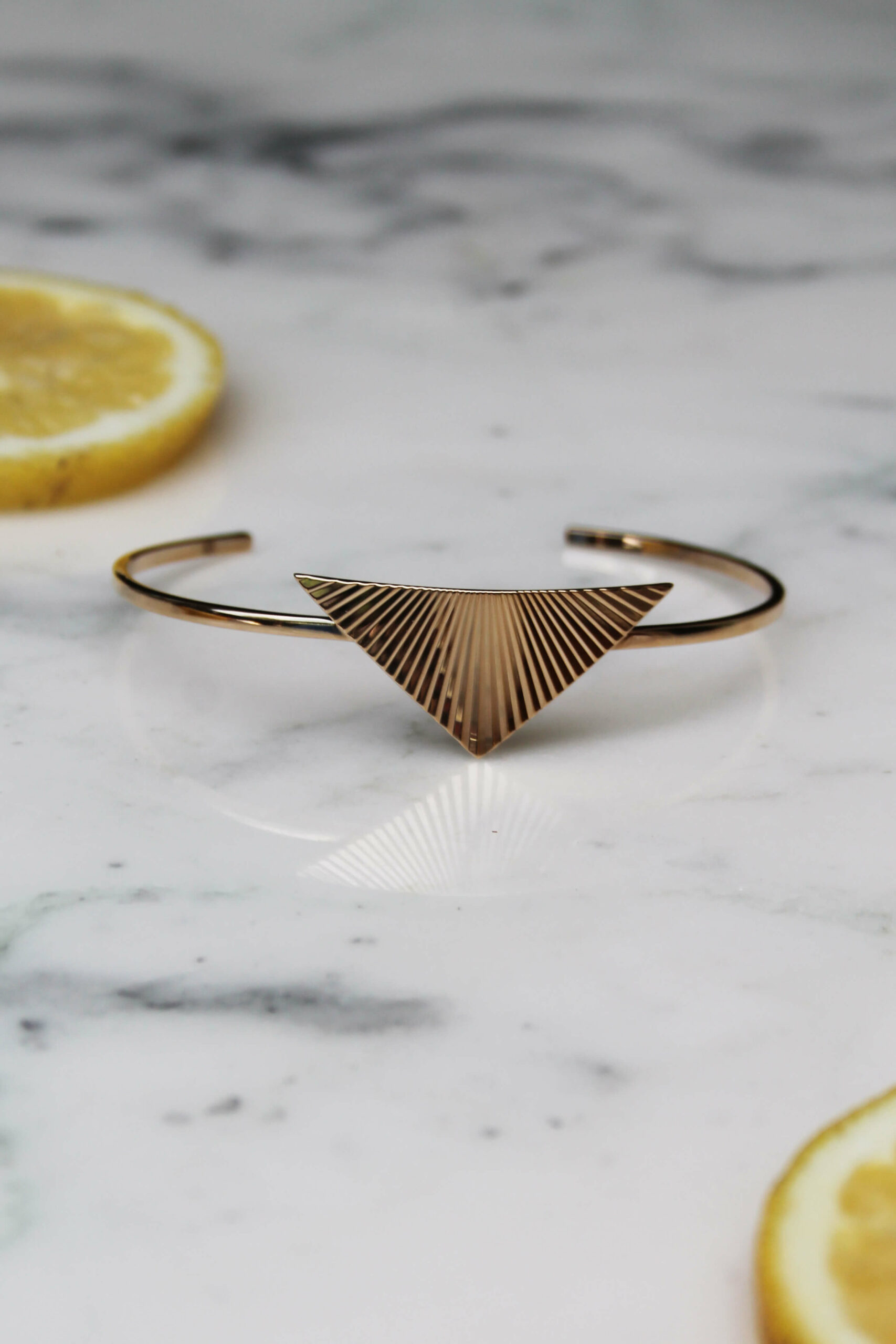 Un jonc fin au style moderne et géométrique. Le bracelet Konya s’orne d’un beau triangle en or strié, et sublime notre poignet d’une élégance solaire.