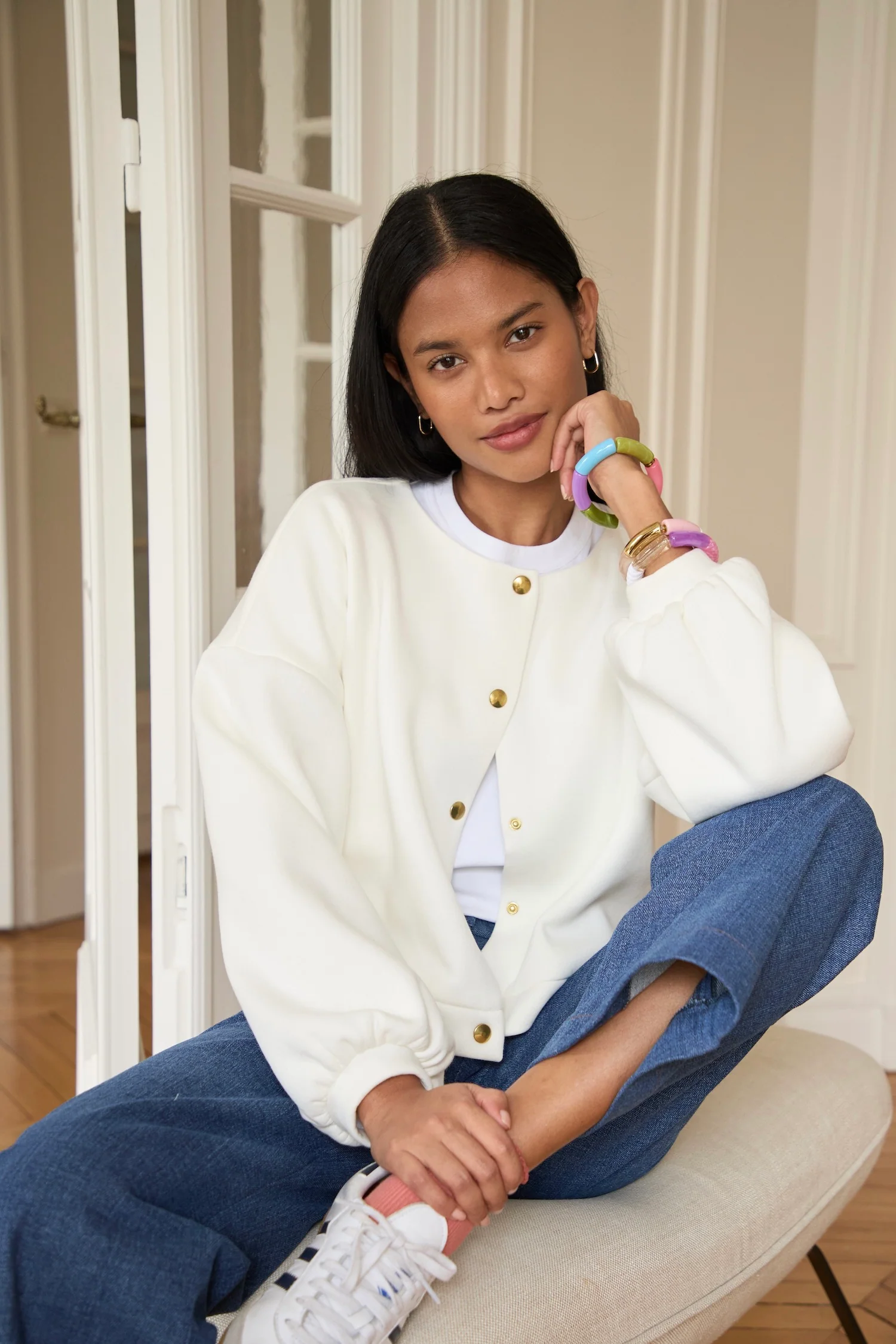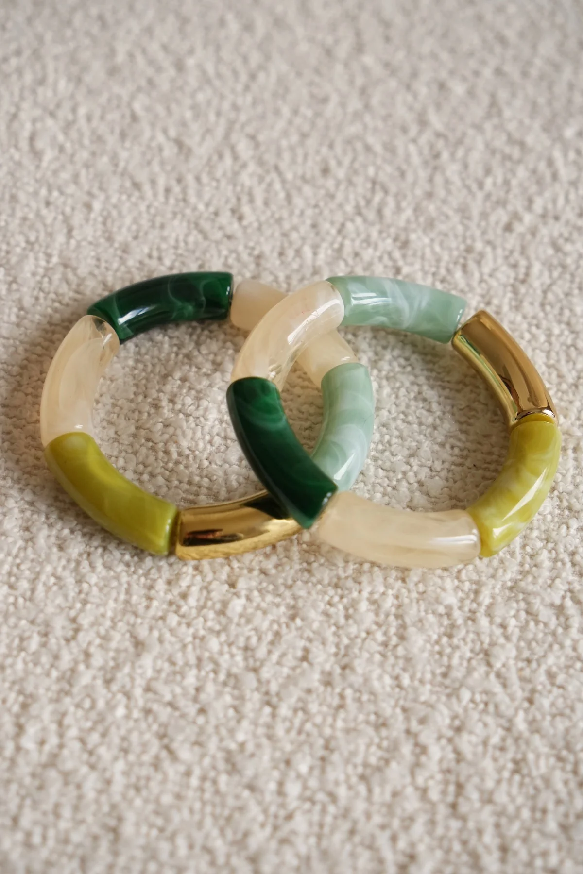 On adore le mélange de coloris et de matières des perles de ce jonc à porter seul ou en accumulation.