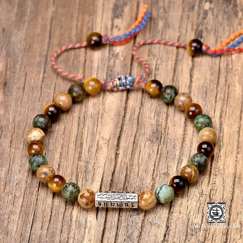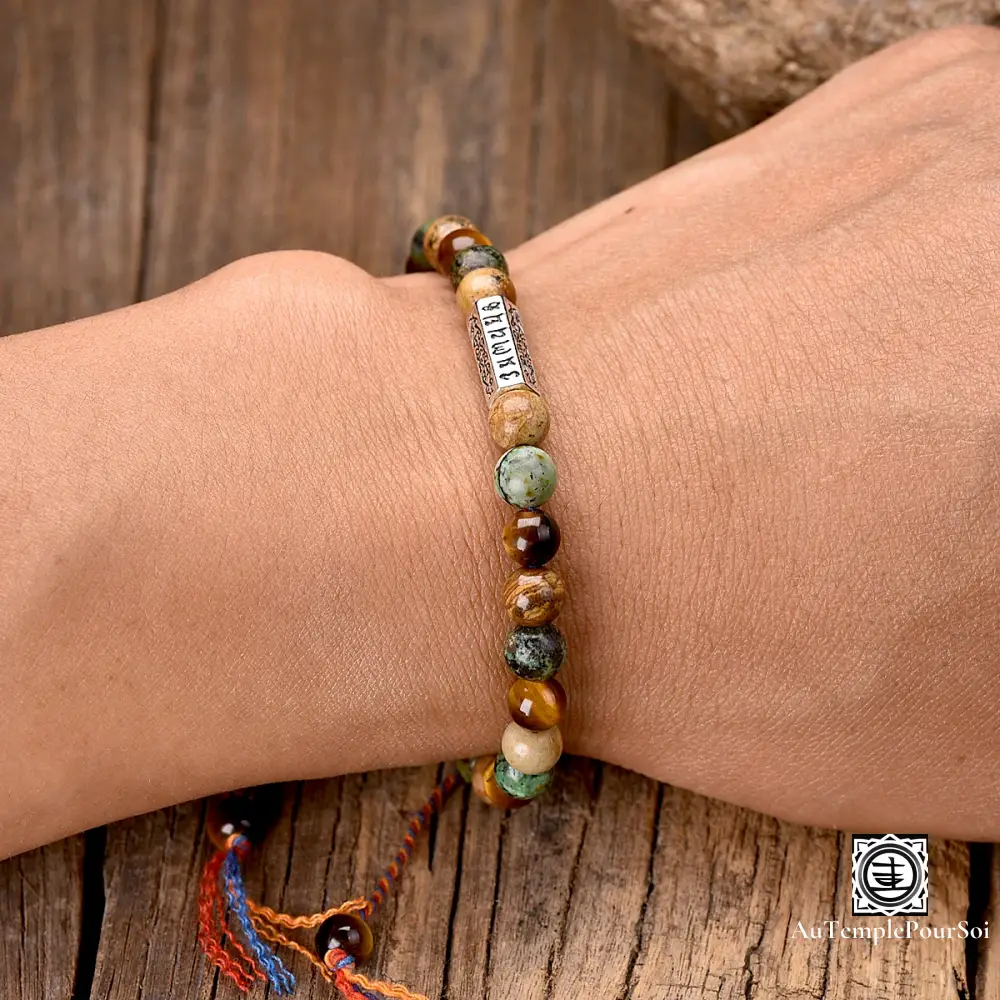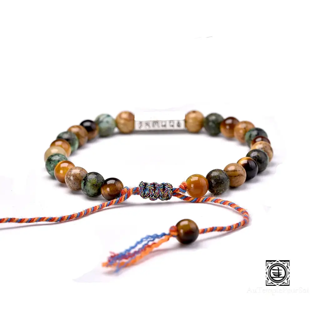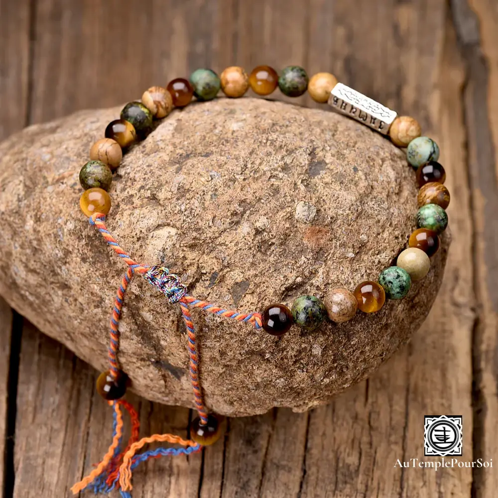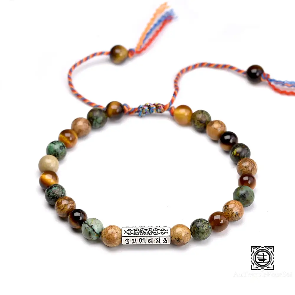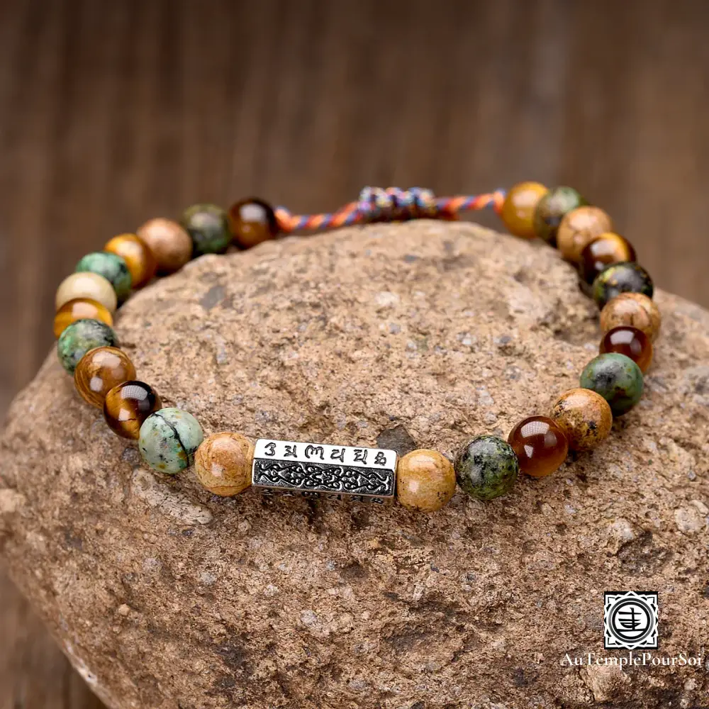 Imprégnez-vous de la sagesse bouddhiste avec ce bracelet tibétain en pierres naturelles, orné de perles de 6 mm et d’un charme gravé des six syllabes sacrées ‘OM Mani Padme Hum’.