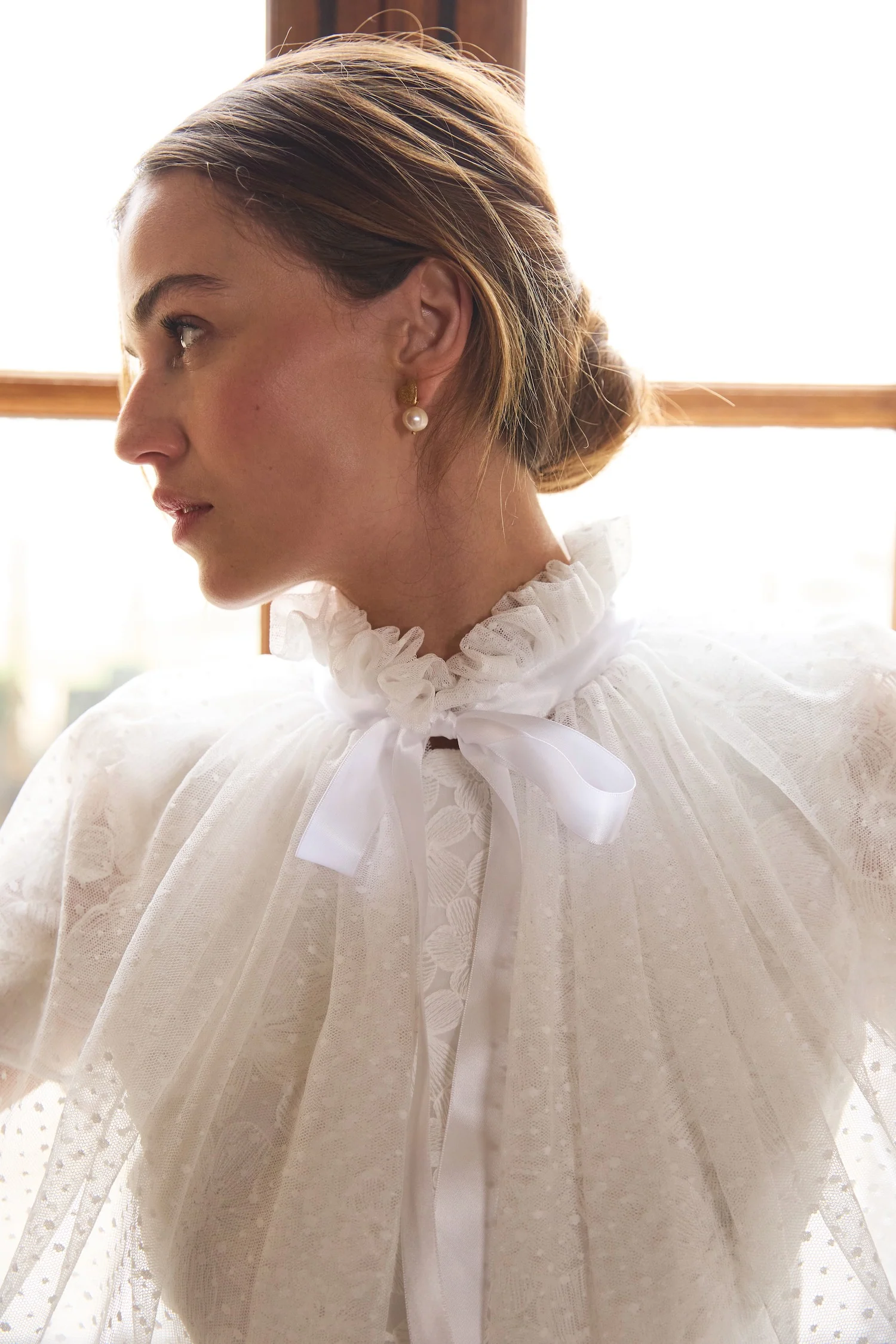 Charme et poésie pour cette capeline qui enveloppe la mariée dans un nuage de plumetis. Le col froncé encadre le visage et le jeu de transparence apporte beaucoup d’élégance à la silhouette. Idéale pour une cérémonie, elle pourra remplacer un voile ou réchauffer la mariée pendant un cocktail à l’extérieur.