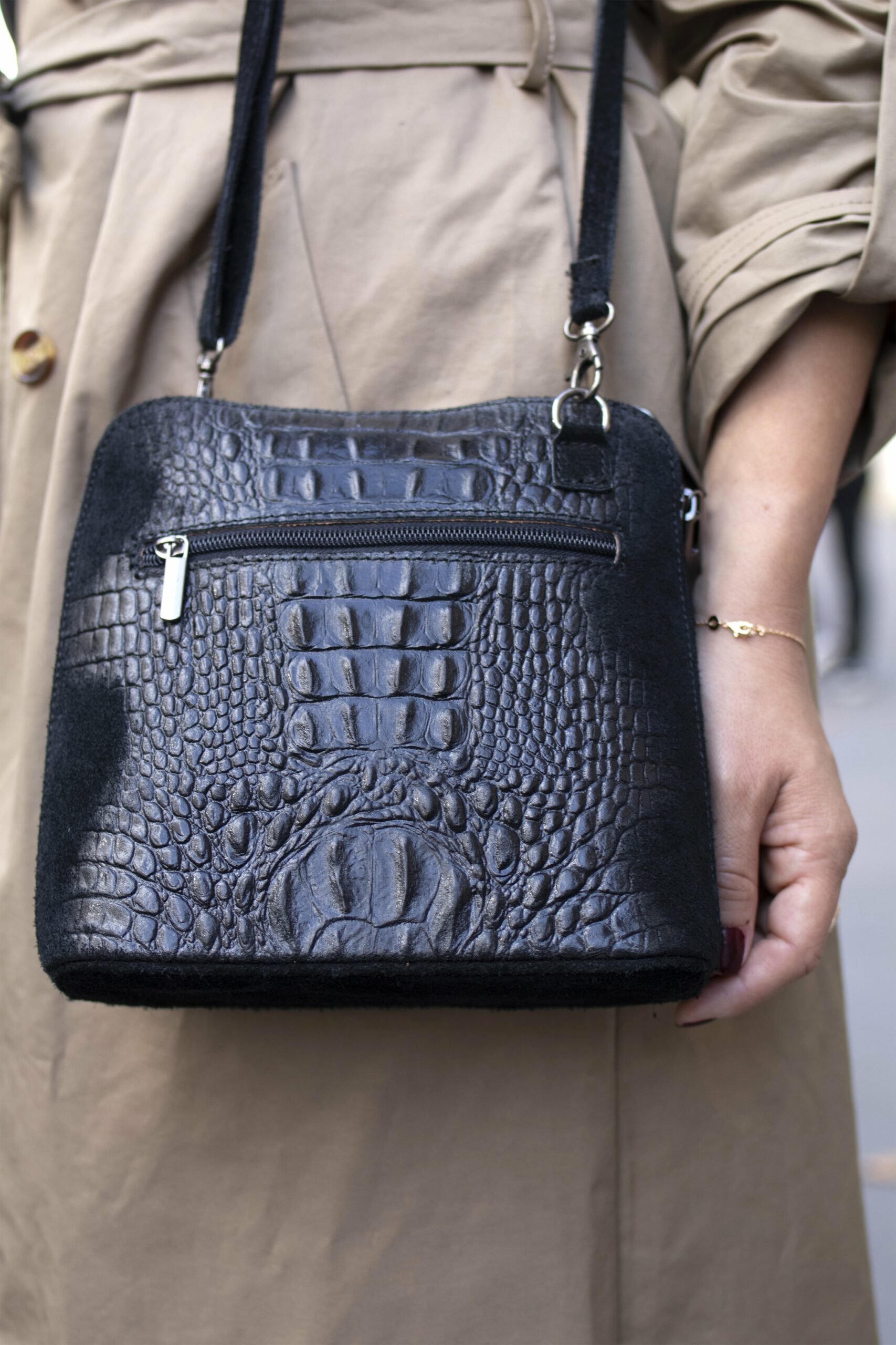 - Sac à main en cuir noir, entre le cuir lisse et la suédine selon les endroits du sac