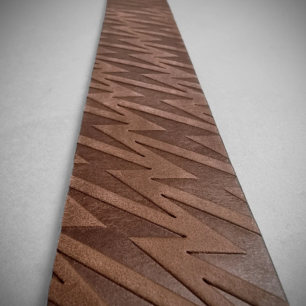 Ceinture beige en cuir véritable avec motif « LIGHTNING » engravé au recto. Boucle en métal personnalisée HYRAW. Logo HYRAW, logo signature H et mentions légales imprimés en noir au verso.