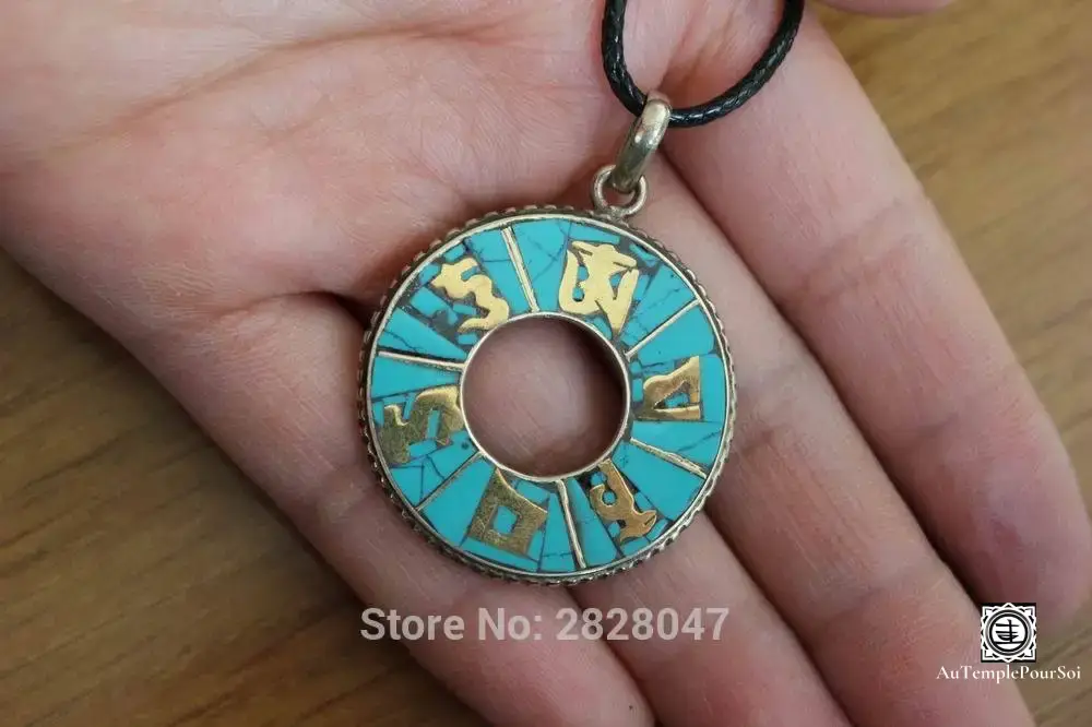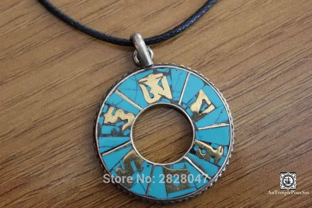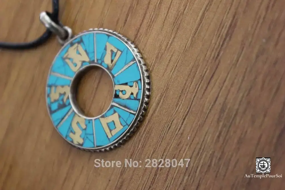 Le « Cercle de Mantras » est un pendentif circulaire fait à la main au Népal, une pièce d’artisanat qui émane la beauté ethnique tibétaine. Incrusté de turquoise et fini avec élégance en cuivre, ce bijou porte en son cœur le Six Mantras Om Mani Padme Hum, offrant une symphonie de spiritualité à celui qui le porte.