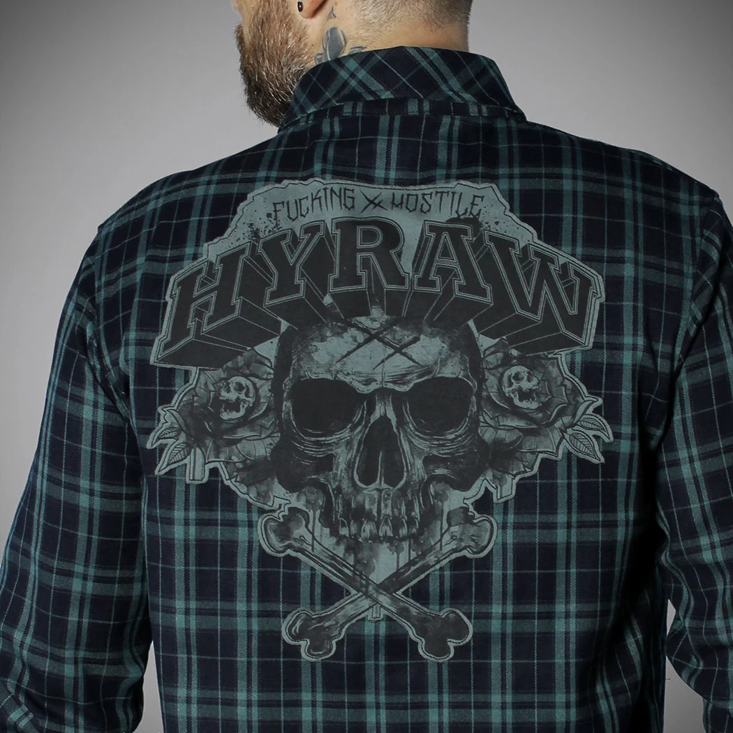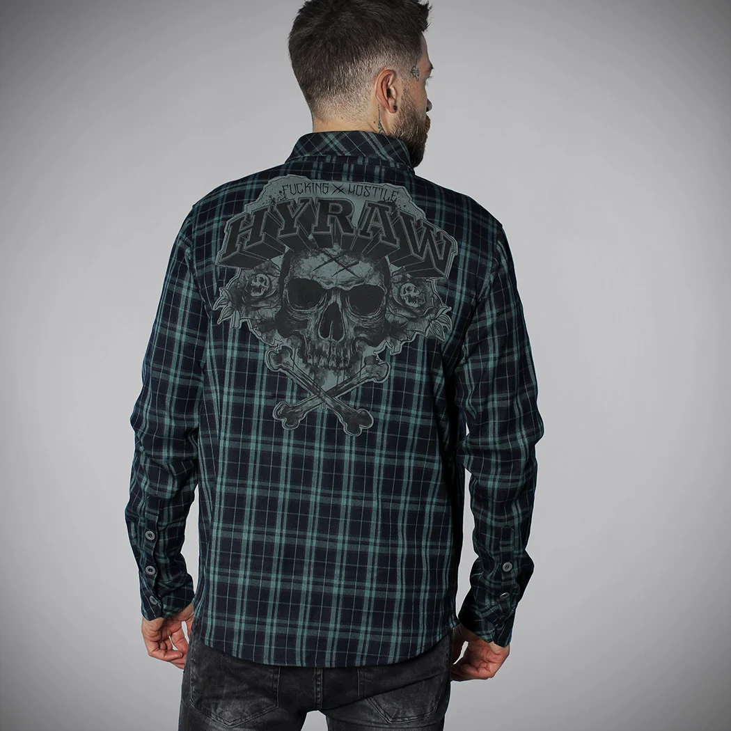 Collection AUTOMNE 2023 – Chemise manches longues à carreaux dans les tons bleu-verts sombres. Broderie blanche du logo HYRAW au dessus de la poche avant gauche et empiècement cousu dans le dos représentant une tête de mort avec des roses et le logo HYRAW. Bas de chemise arrondi.