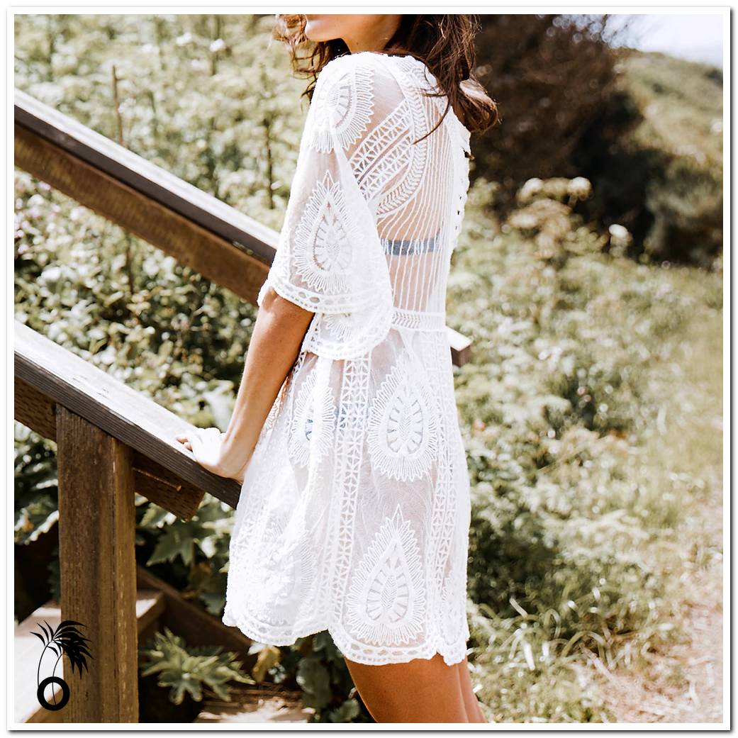 - Forme : robe de plage blanche en dentelle transparente