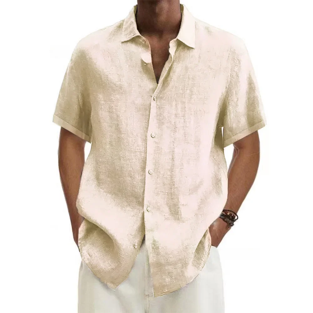Chemise homme en coton et lin beige clair, manches courtes et coupe droite. Légère, élégante et respirante, idéale pour l’été.