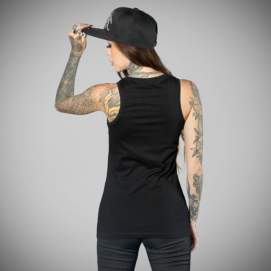 Collection ÉTÉ 2024 – Débardeur classique noir, col rond à large décolleté, avec impression 3 couleur du visuel FCK OFF sur le devant. Dessin original de l’artiste-illustrateur Isur – Artwork by Hyraw Design.