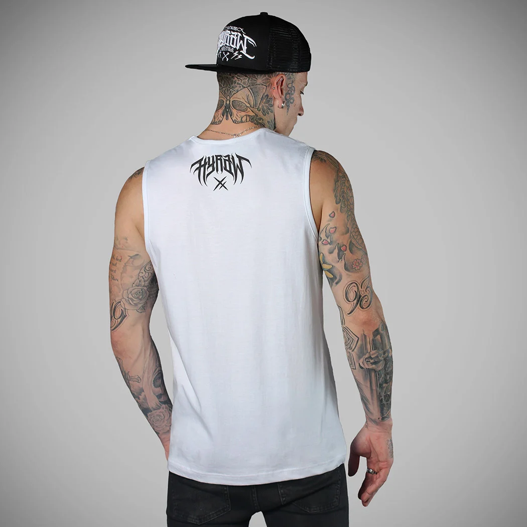 Série Limitée ÉTÉ 2025 – Débardeur classique blanc avec impression noire du visuel FUCK sur le devant et du logo Hyraw en noir sur la nuque. Débardeur imprimé en France.