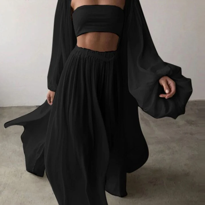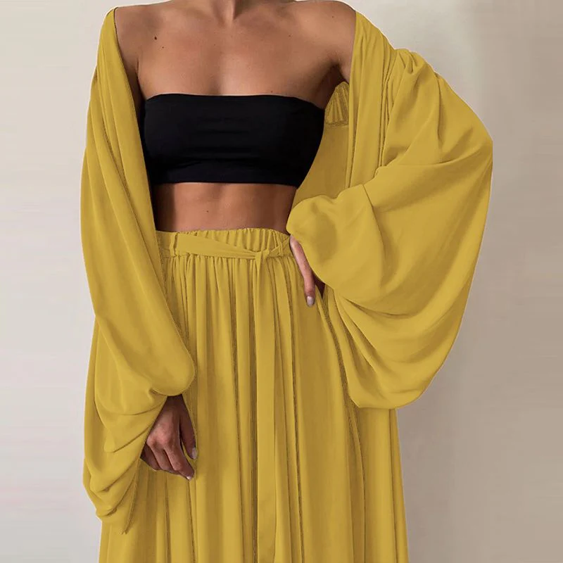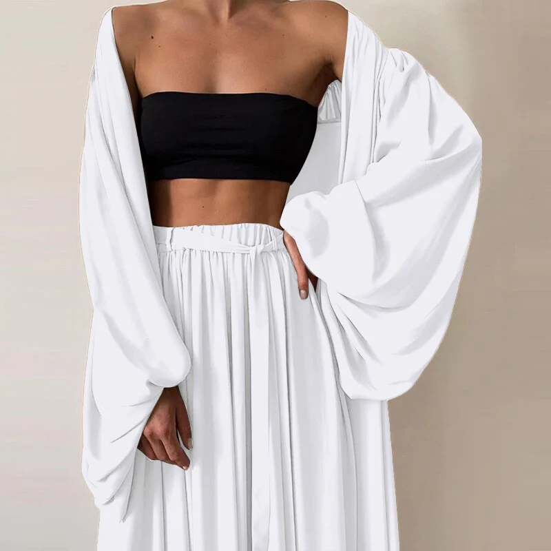 Nous vous proposons ici un ensemble en 2 pièces, décontracté et ample pour femme, avec manches longues et bouffantes. C’est une tenue pour maison dans un style original qui augmente votre charme féminin.