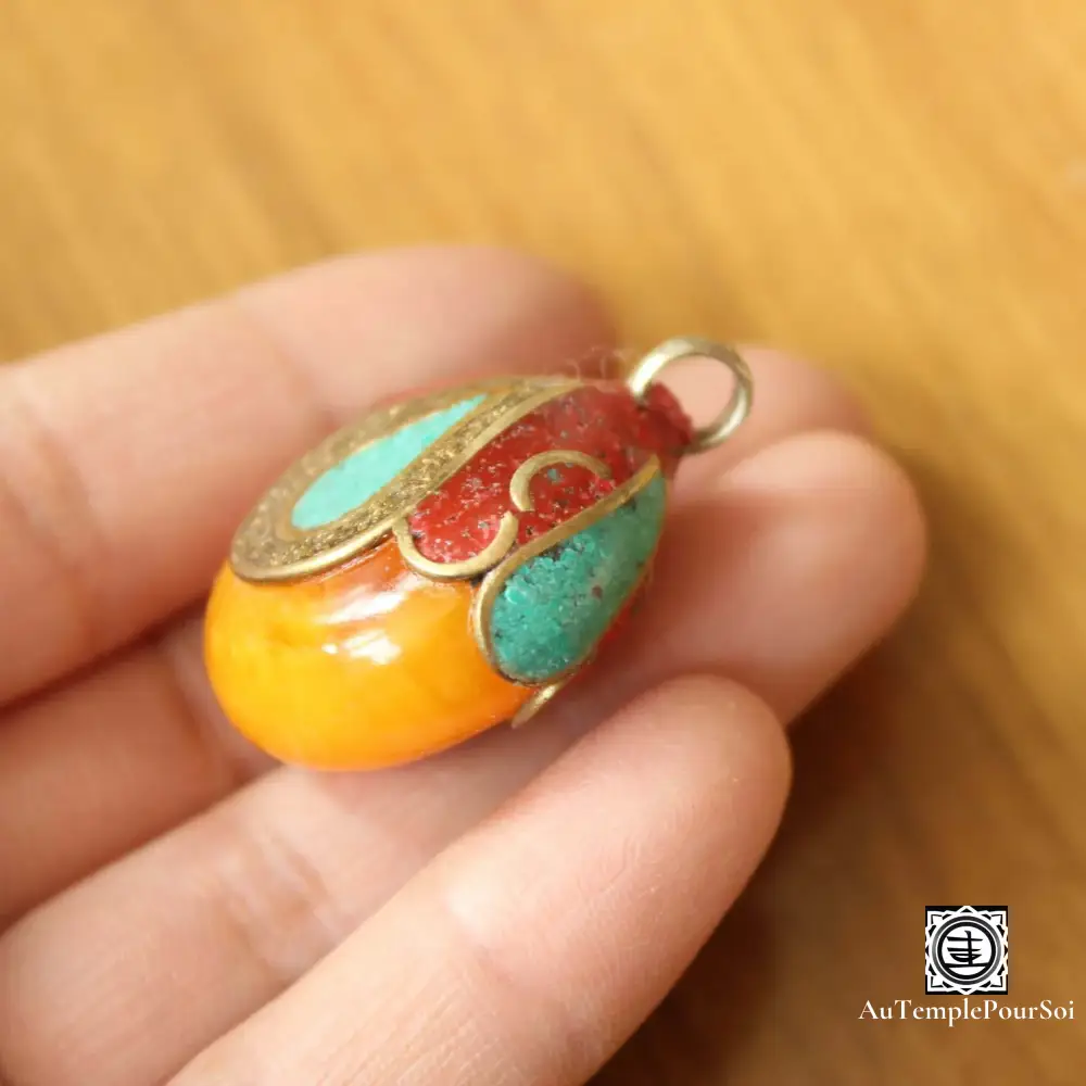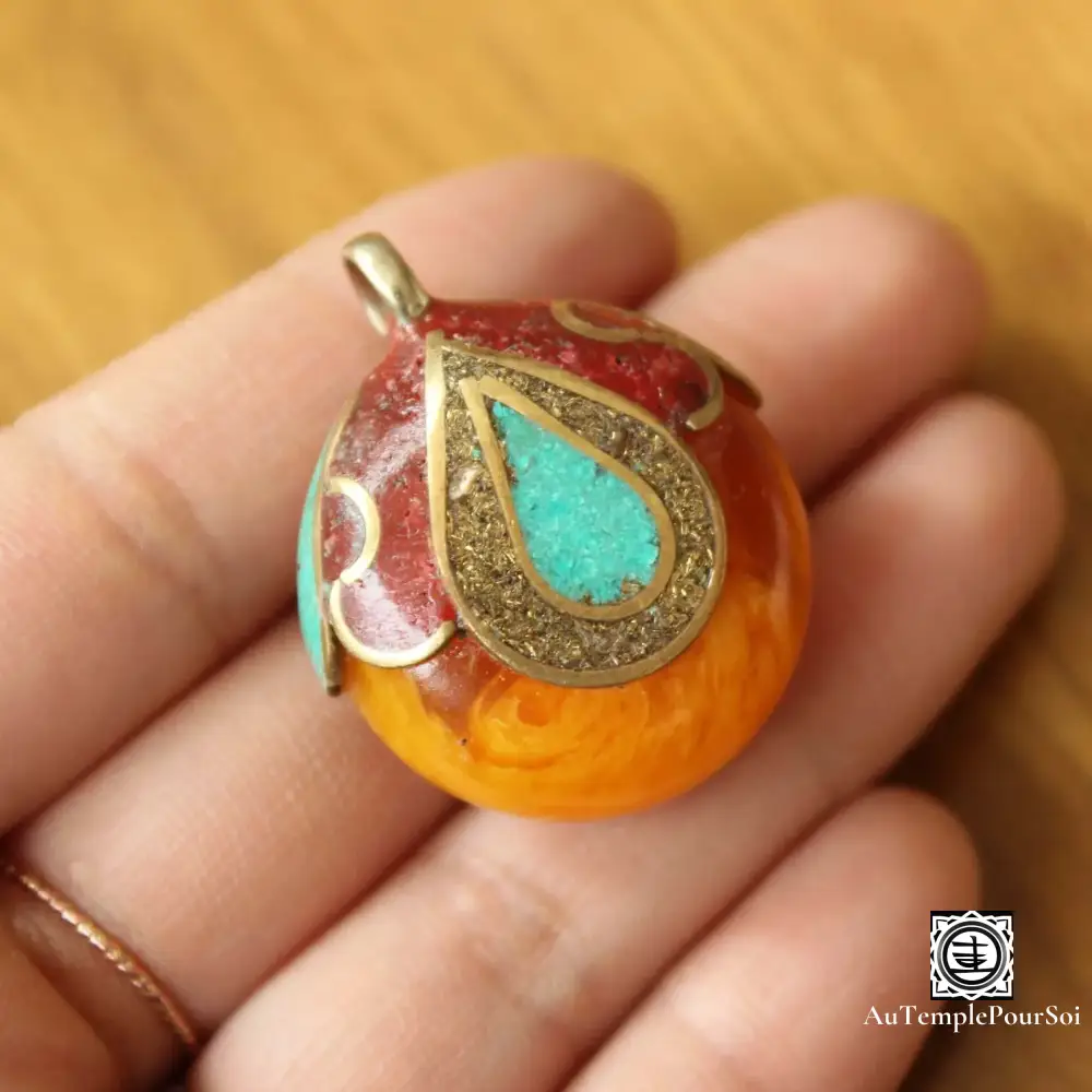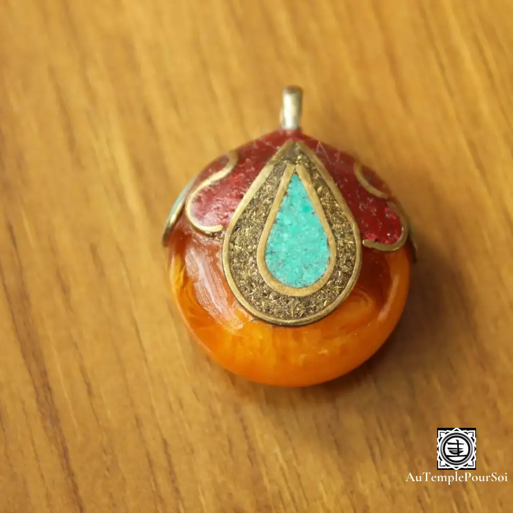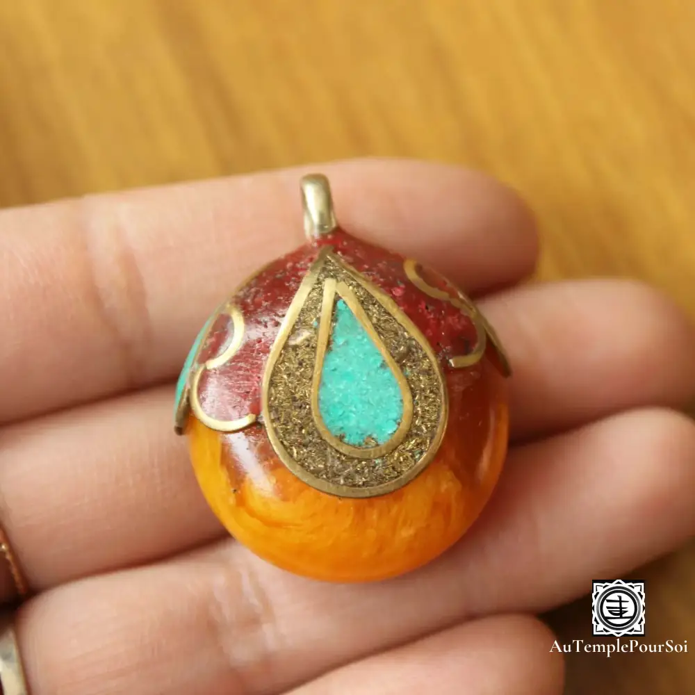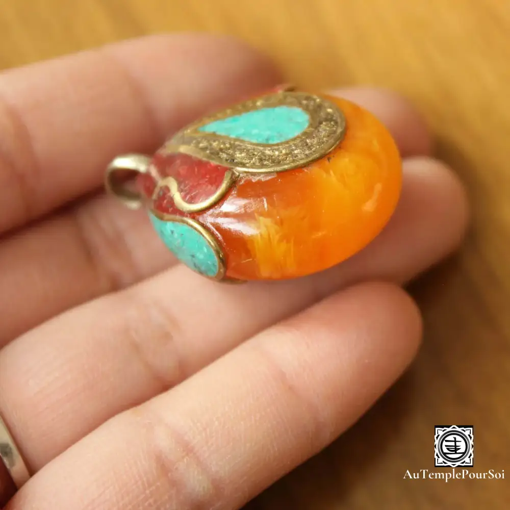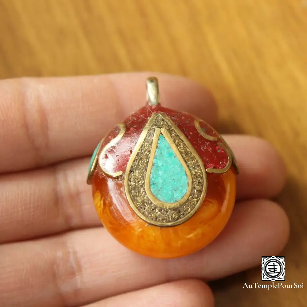 La résine d’ambre, choisie pour sa couleur riche et son éclat naturel, est associée à la turquoise pour une combinaison qui rappelle les paysages terrestres et célestes. Le laiton, avec sa patine dorée, offre un contraste élégant et ajoute une touche d’authenticité à ce pendentif inspiré de la nature.