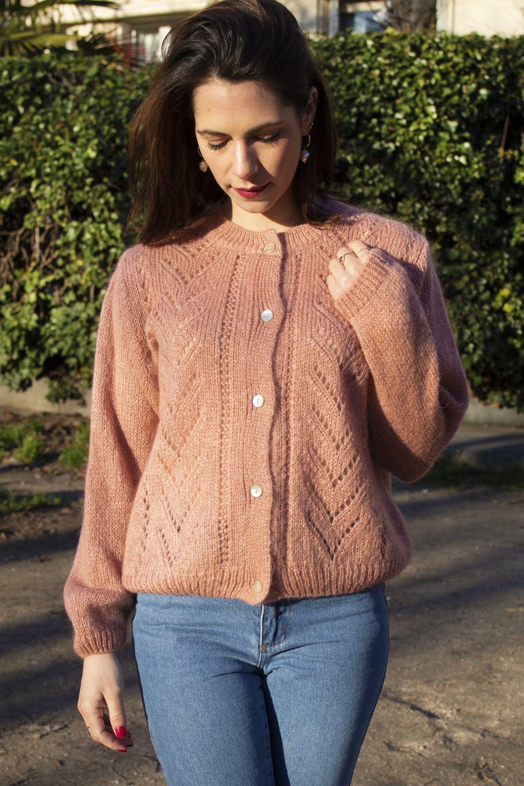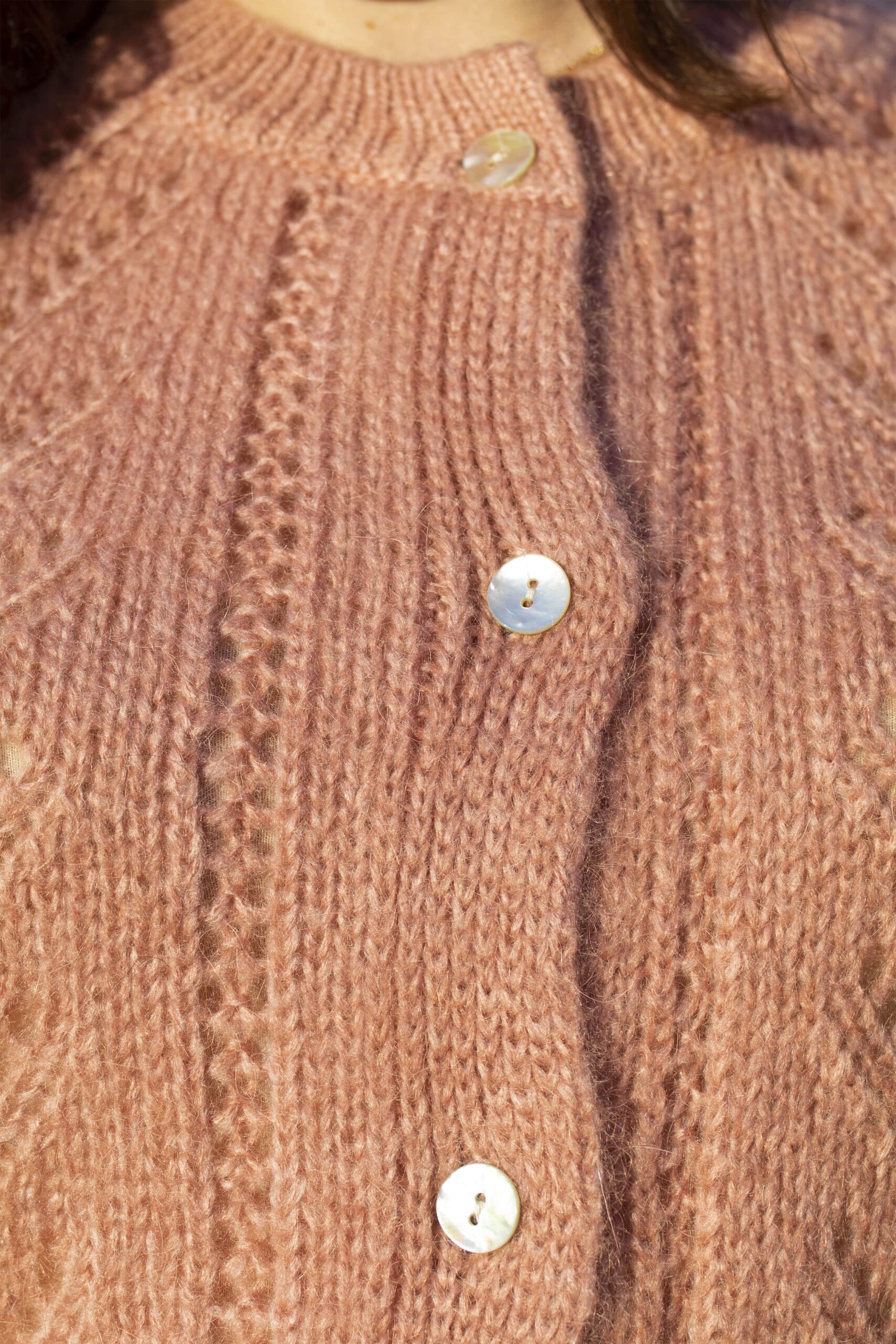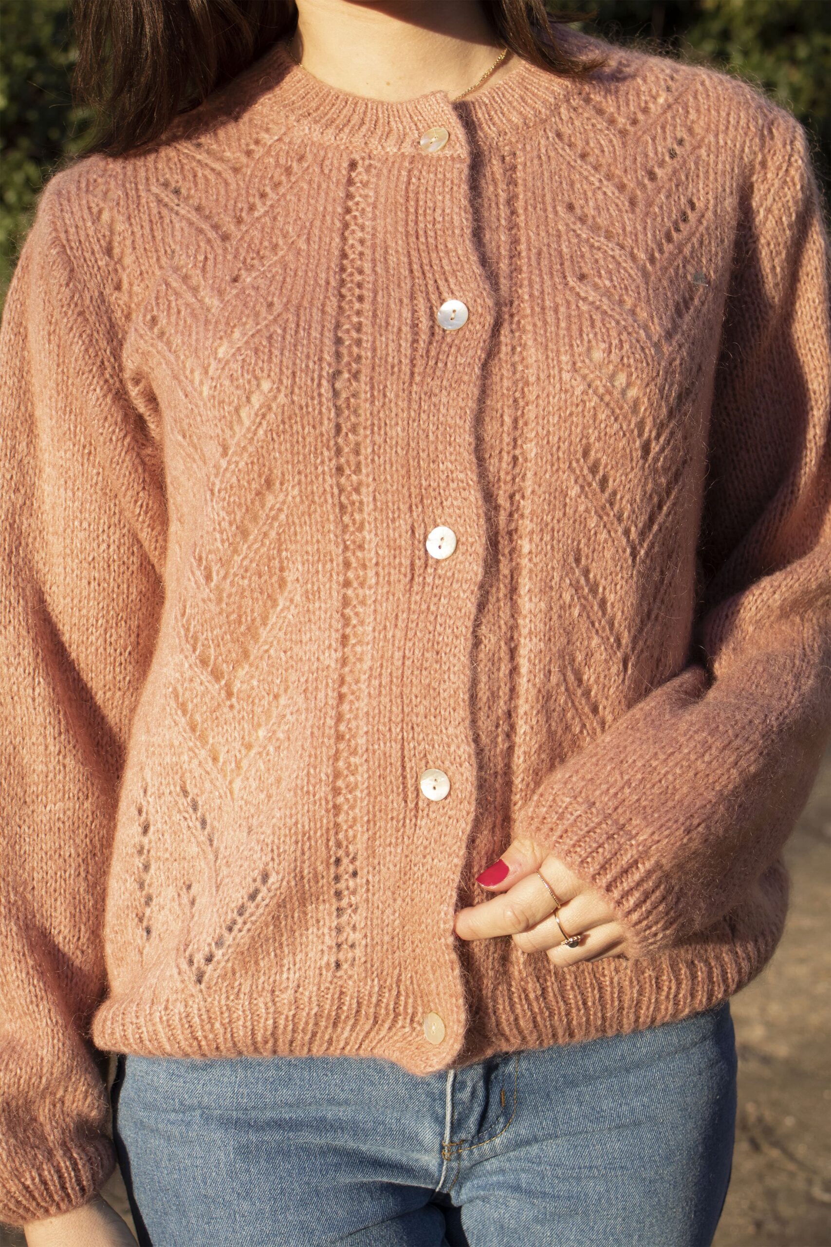 Un gilet en maille ajourée accompagné de beaux boutons de nacre. Elyn se porte facilement au quotidien, en hiver comme à la mi-saison, pour nous préserver de la fraîcheur avec style !