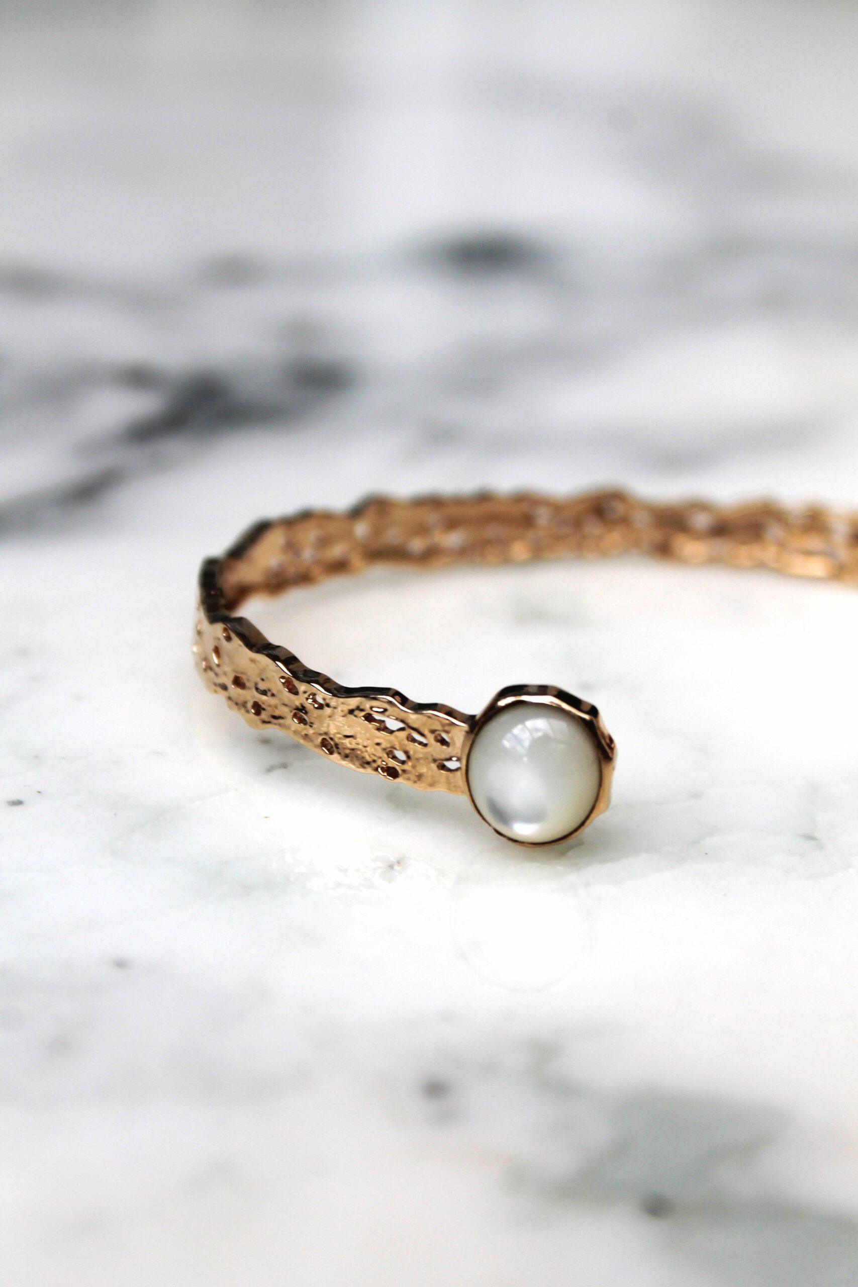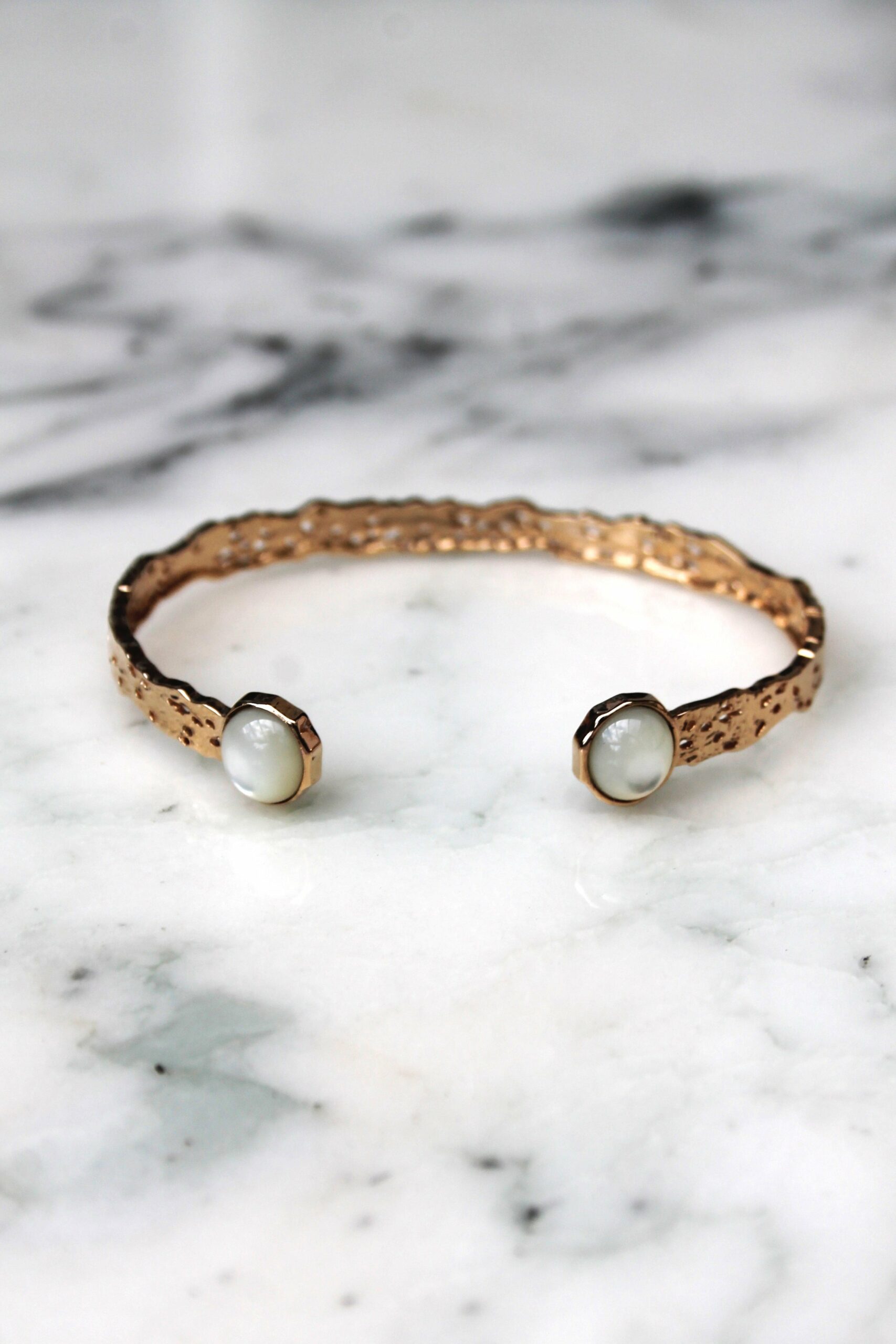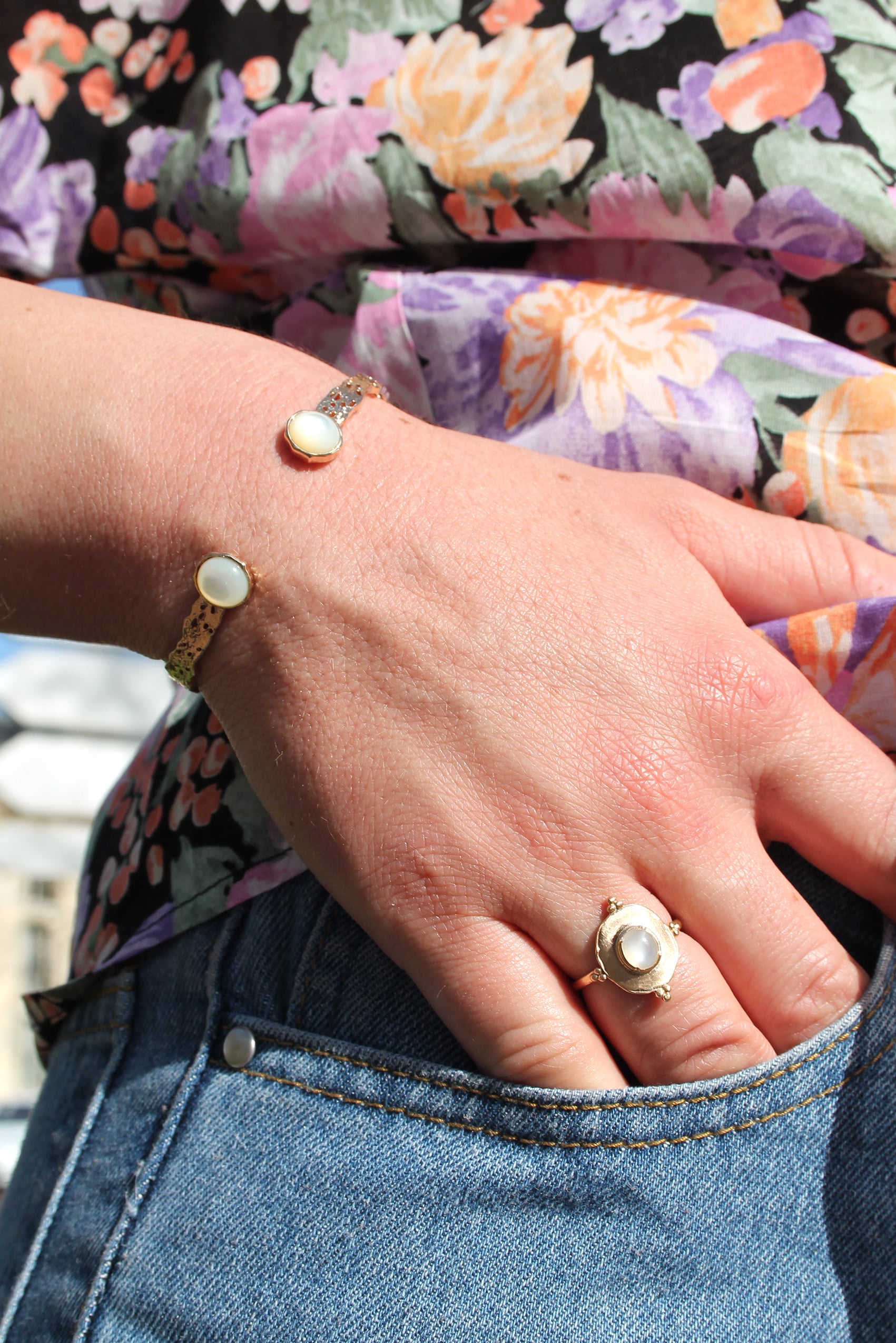 Un bracelet artistique et féminin, qui s’accompagne de deux ravissants cabochons de nacre.