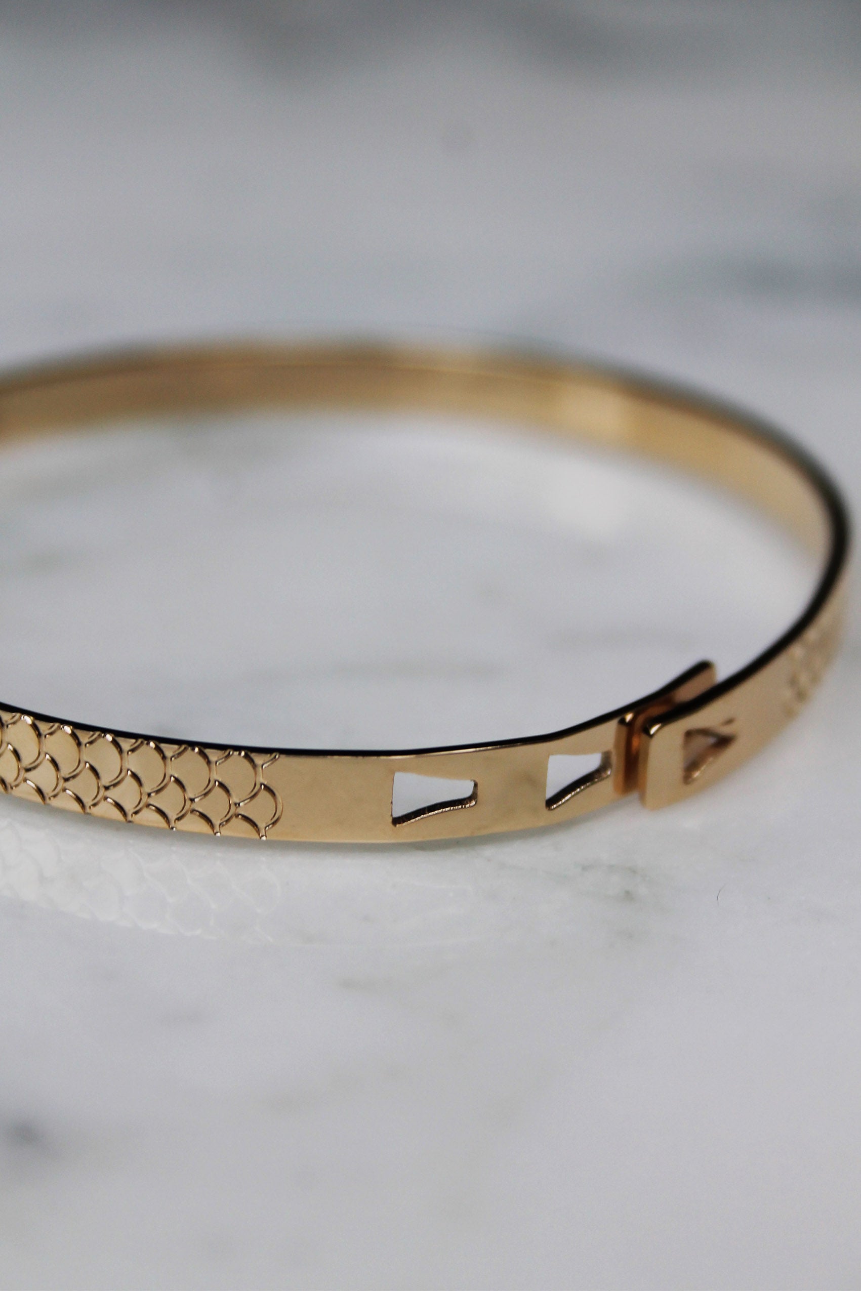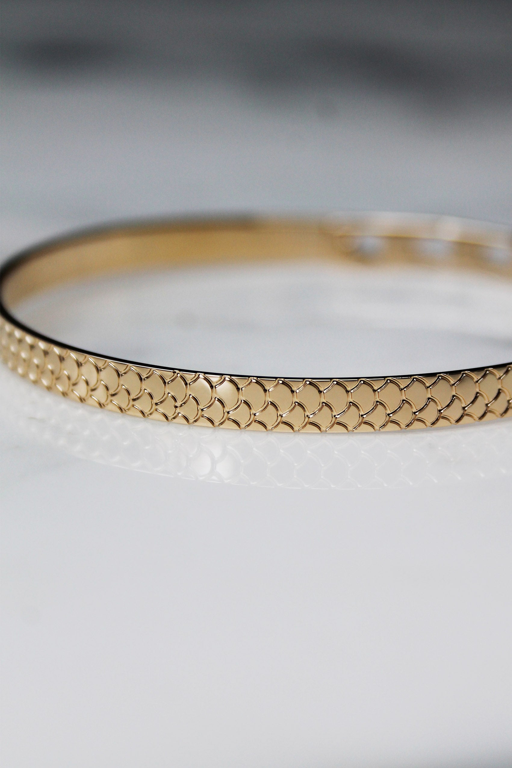 L’incontournable jonc est ici retravaillé d’une gravure arrondie qui nous évoque les écailles d’une sirène. Réglable sur 3 crans différents, vous pouvez parfaitement ajuster le jonc Hélène à votre poignet !
