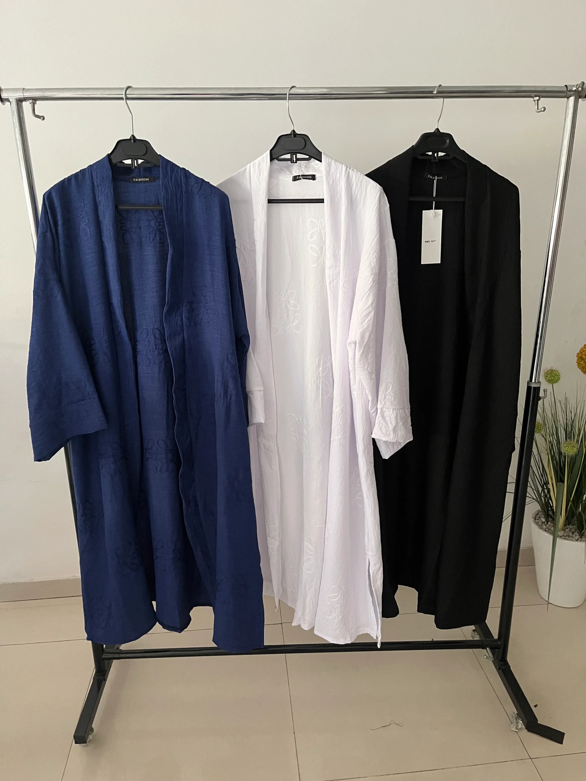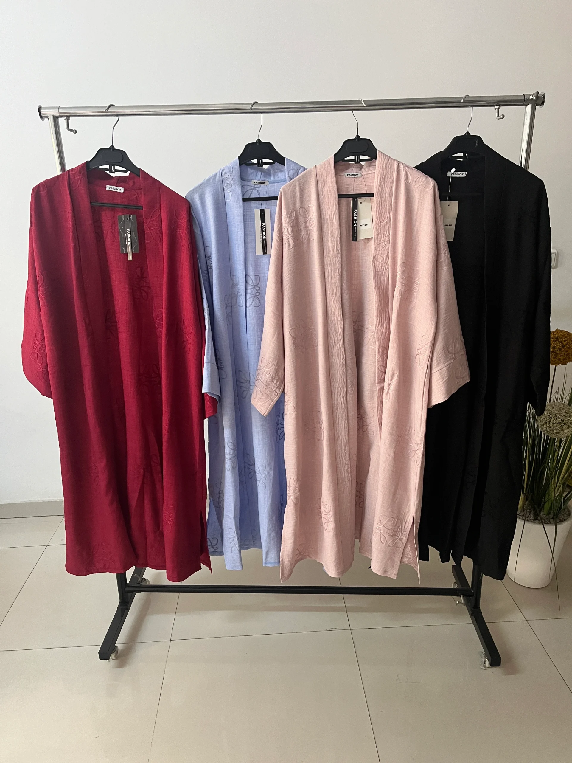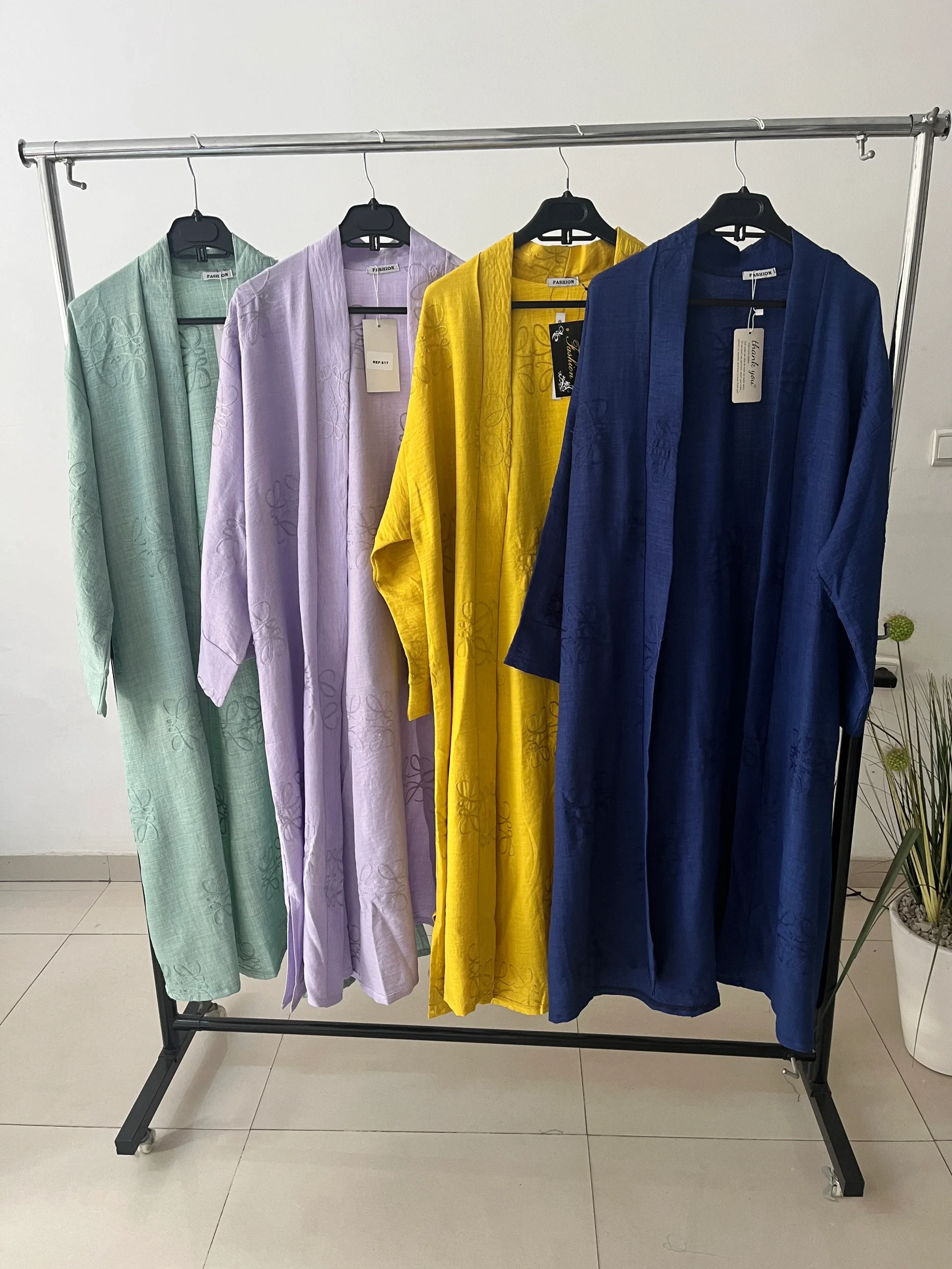Chaque kimono est orné de broderies discrètes et délicates ton sur ton, ajoutant une dimension subtile et sophistiquée à votre look. La coupe ample et la longueur mi-mollet offrent un tombé fluide et gracieux, convenant à toutes les morphologies.