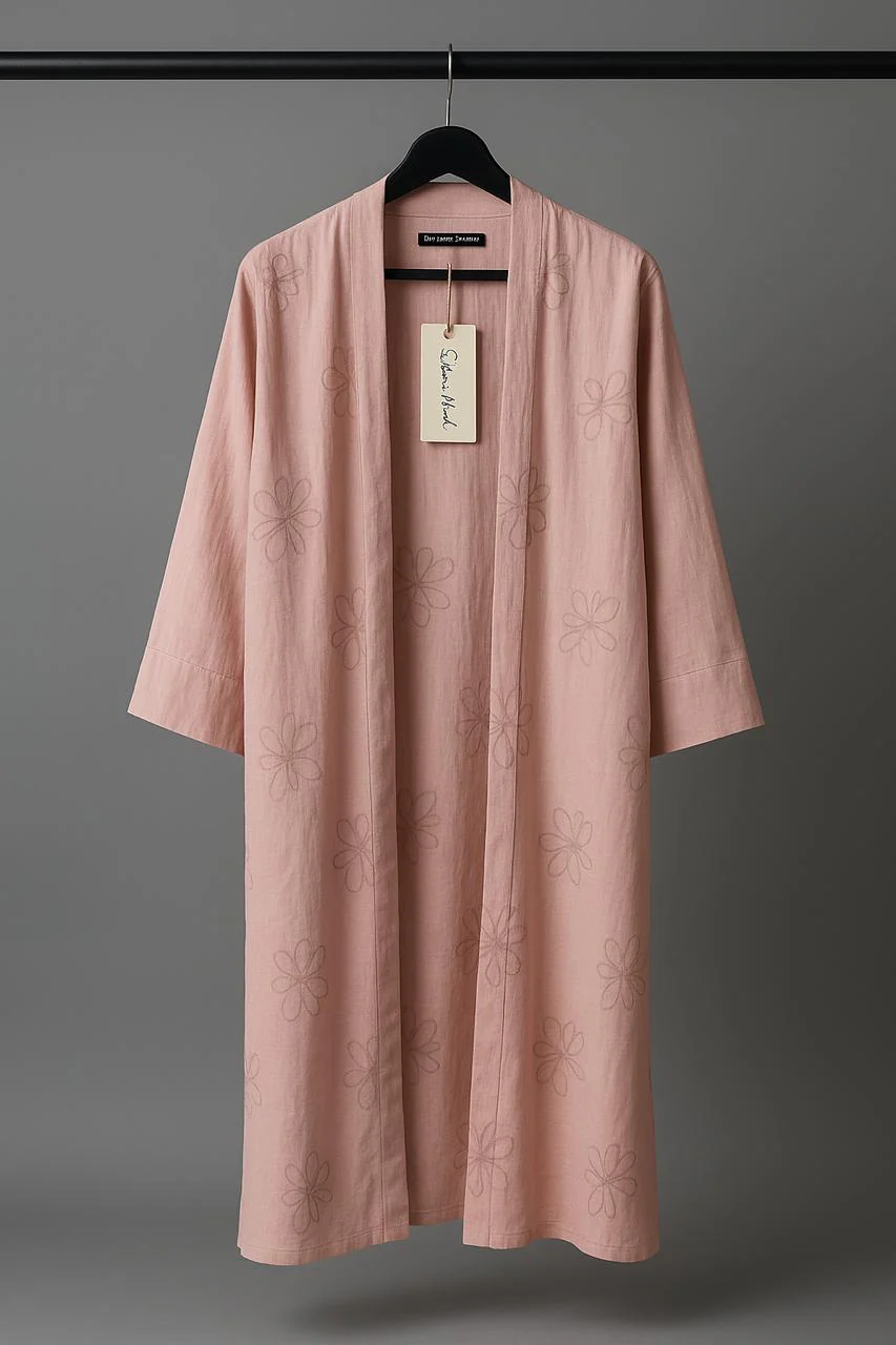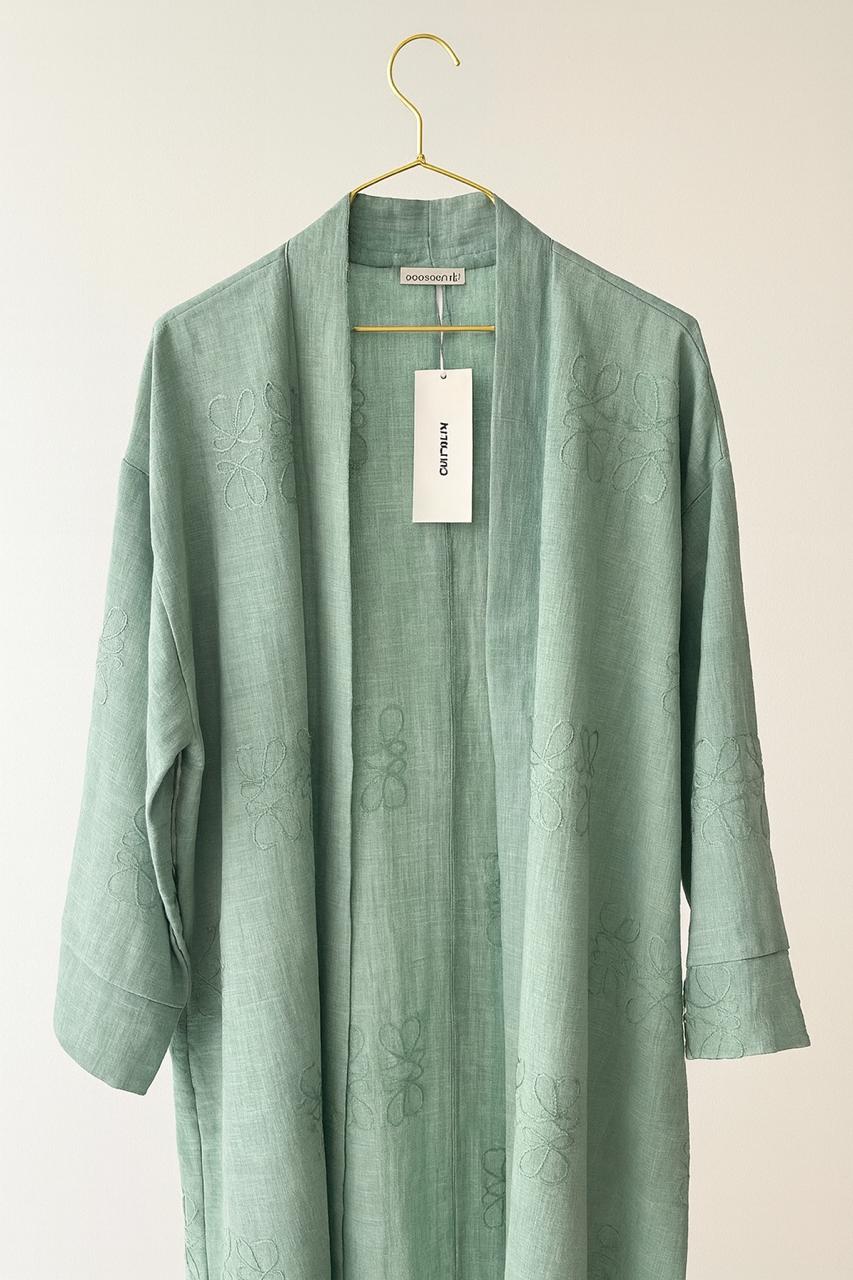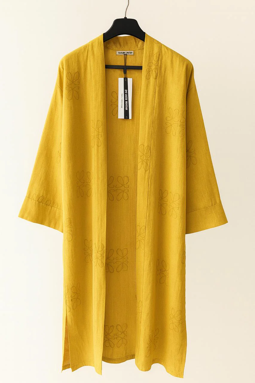 Chaque kimono est orné de broderies discrètes et délicates ton sur ton, ajoutant une dimension subtile et sophistiquée à votre look. La coupe ample et la longueur mi-mollet offrent un tombé fluide et gracieux, convenant à toutes les morphologies.