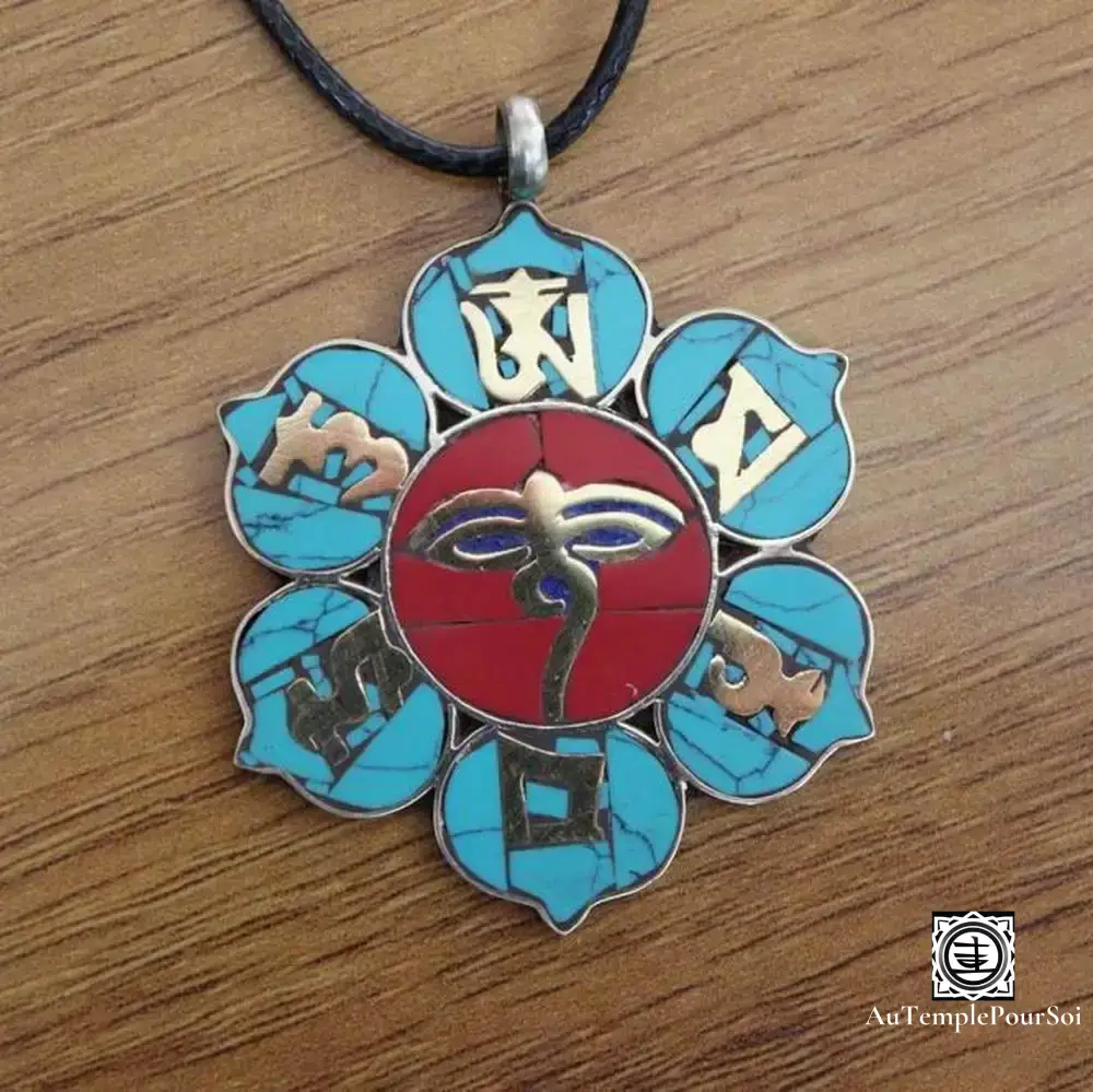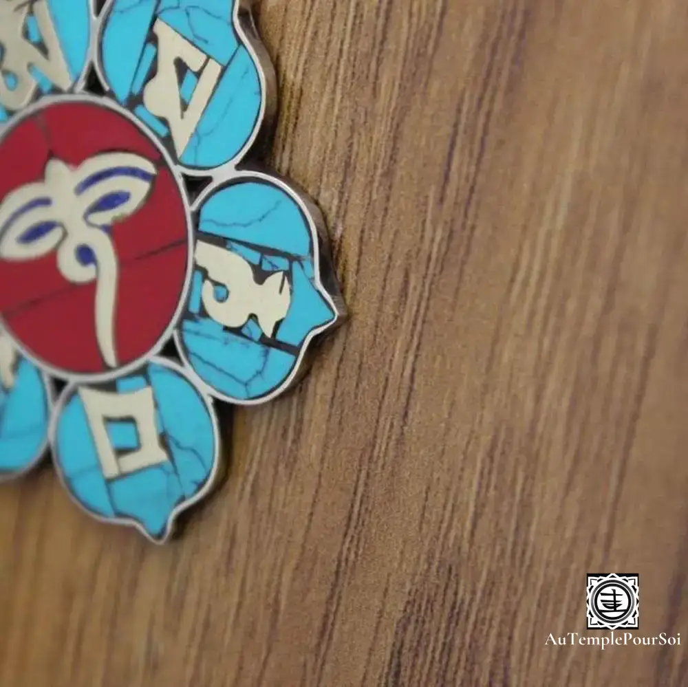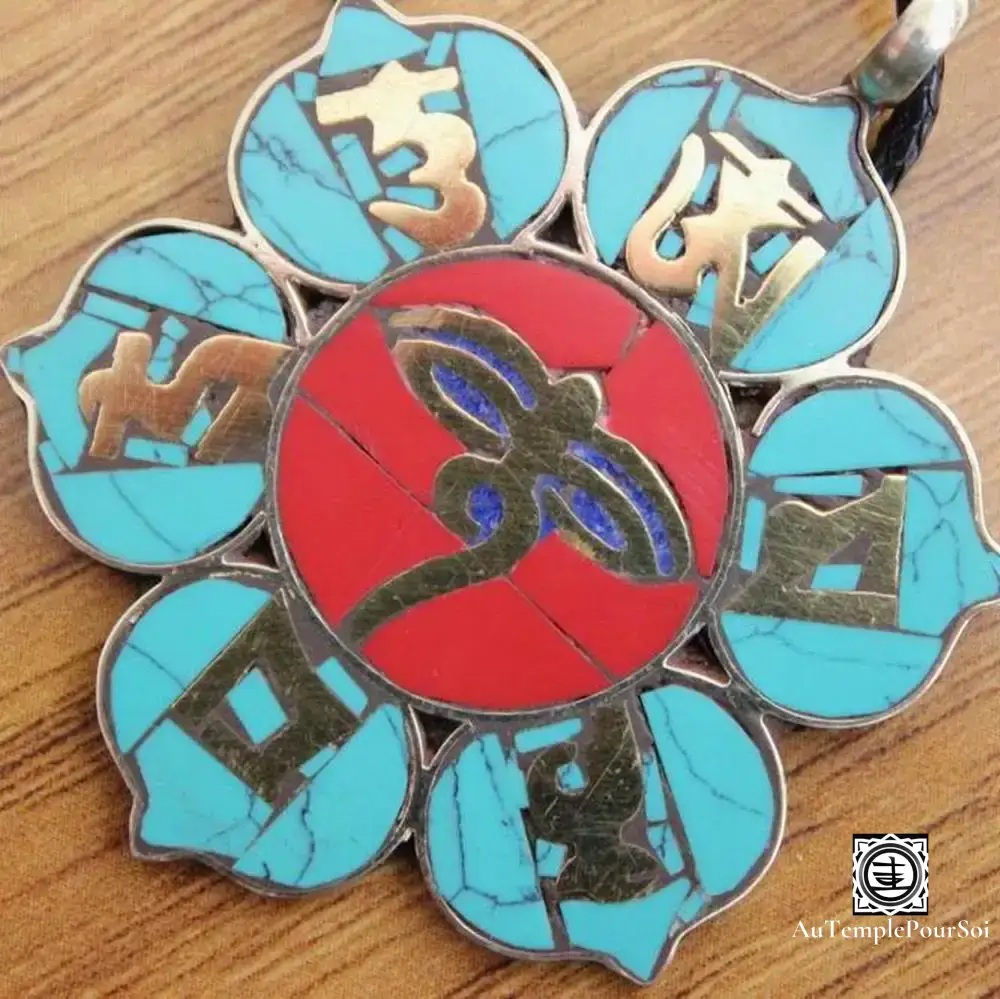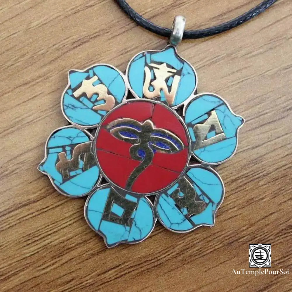 Chaque pendentif incarne l’essence de la sagesse bouddhiste, avec des mantras qui rappellent le chemin vers l’illumination. La turquoise, pierre de guérison et de communication, et le corail, symbole d’énergie et de protection, s’allient pour créer un bijou qui est à la fois protecteur et inspirant.