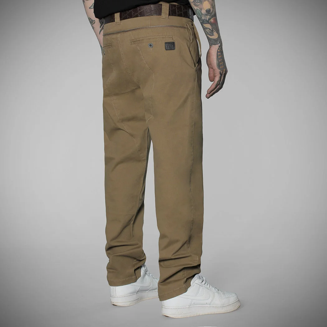 Collection HIVER 2024 – Pantalon Chino camel avec boutons et fermeture zippée en métal, 2 poches avant, 1 petite poche à monnaie sur l’avant droit, 2 poches arrière passepoilées avec fermeture par bouton. Motif as de pique imprimé sur les sacs de poches avant et arrière. Lettrage FUCKING HOSTILE imprimé en blanc à l’intérieur au niveau de la ceinture et sous la fermeture zippée. Logo signature « H » brodé sur la jambe droite sous la poche avant. Patch en cuir véritable avec logo Hyraw au dos. Demi-zip fantaisie au-dessus des poches arrière.
