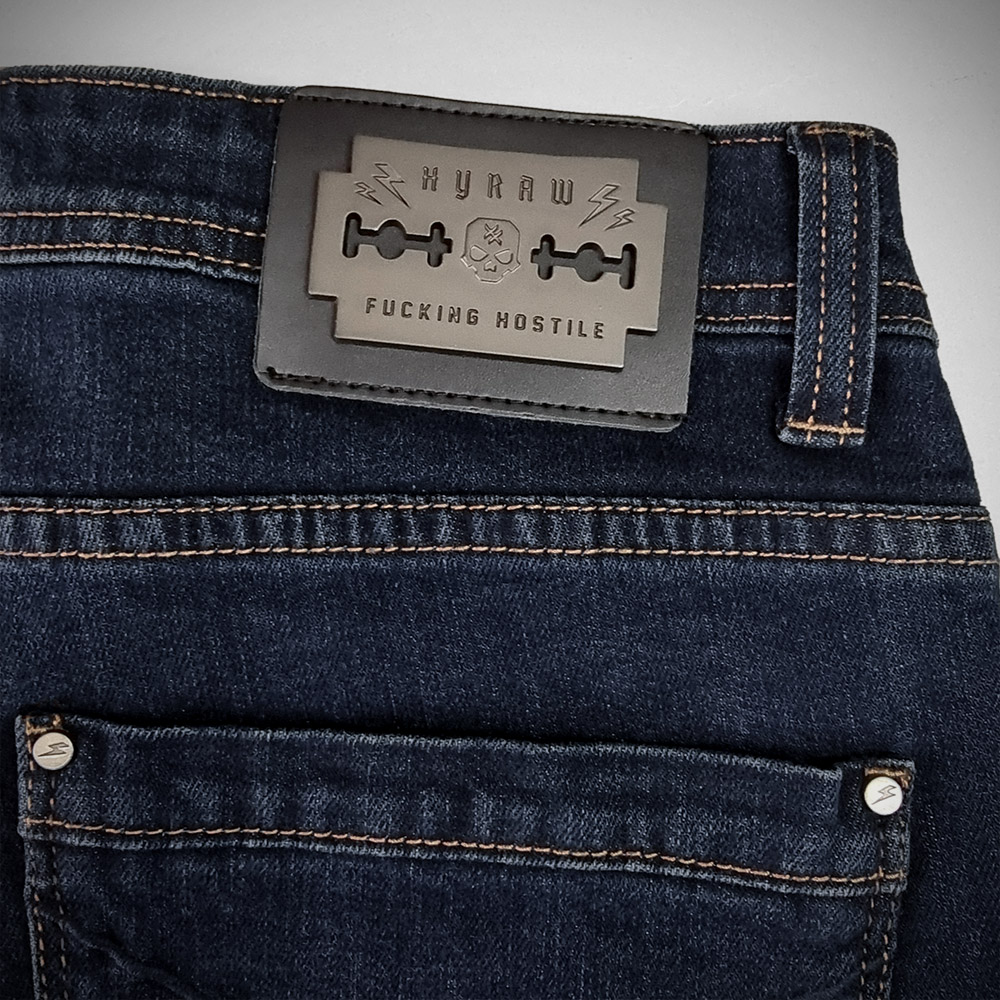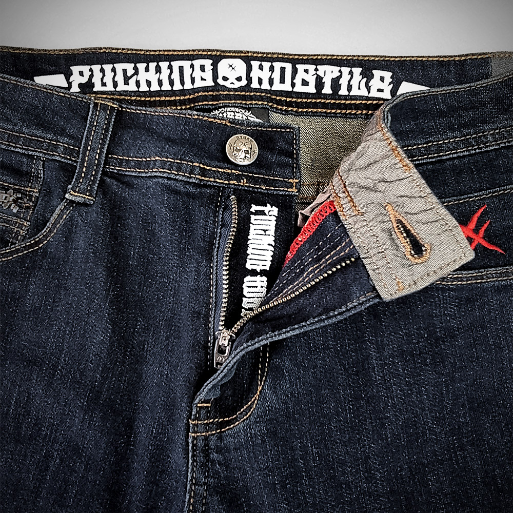 Collection HIVER 2024 – Pantalon en jean bleu foncé avec bouton et fermeture zippée en métal. 2 poches principales devant avec 1 poche ticket zippée sur la poche droite et 1 poche clé de voiture avec logo signature Hyraw brodé en rouge sur la poche gauche. 2 poches arrière avec broderie bleu foncé « Lightnings », motif en as de pique imprimé sur les sacs des poches avant. Ouverture intérieure zippée sur le devant avec impression blanche du lettrage FUCKING HOSTILE. Ceinture intérieure avec impression blanche du lettrage FUCKING HOSTILE. Rivets métalliques gravés sur le devant et l’arrière. Jacron métallique patché en forme de lame de rasoir siglée au dos. Coutures intérieures rouge.