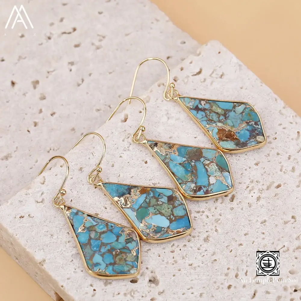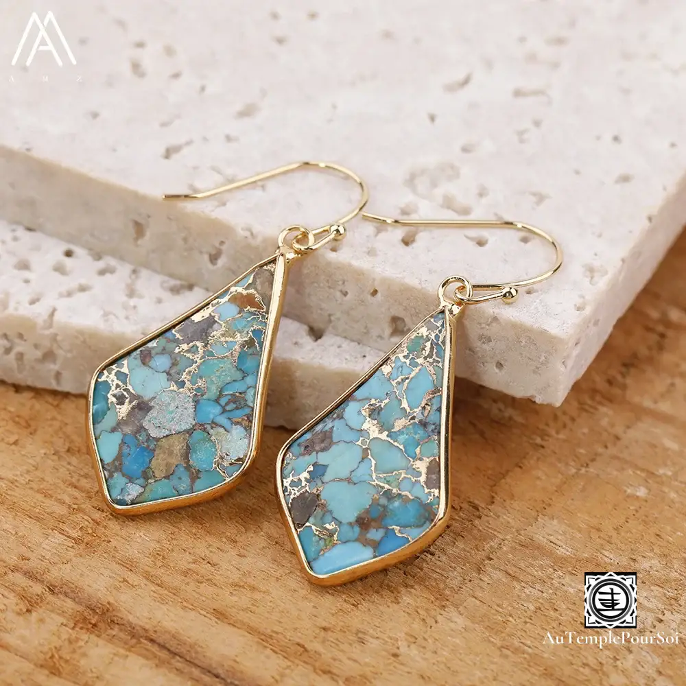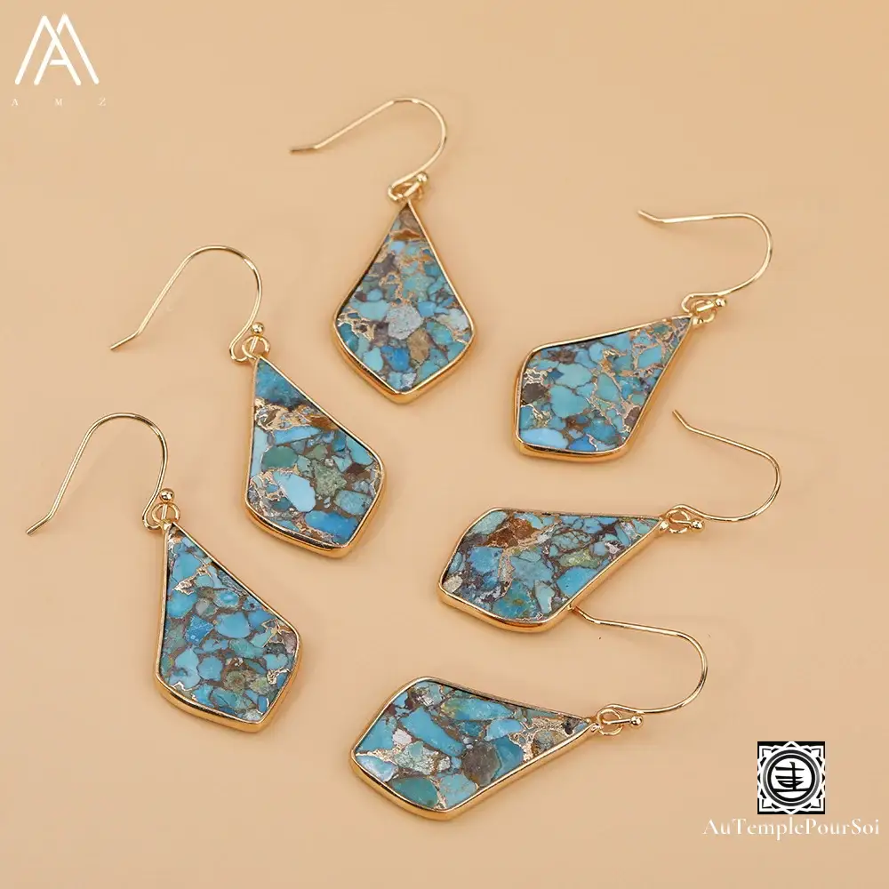 Ces boucles d’oreilles en forme de prisme révèlent la splendeur de la turquoise, une pierre vénérée à travers les âges pour sa couleur céleste et ses propriétés curatives.