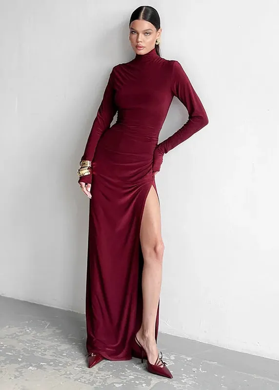 Craquez pour cette robe longue moulante au style sophistiqué et intemporel. Son col roulé apporte une touche élégante et réconfortante, idéale pour l’automne et l’hiver. Avec sa fente latérale et ses manches longues, cette robe col roulé est parfaite pour une soirée habillée ou une sortie chic. Disponible en rouge bordeaux et noir.