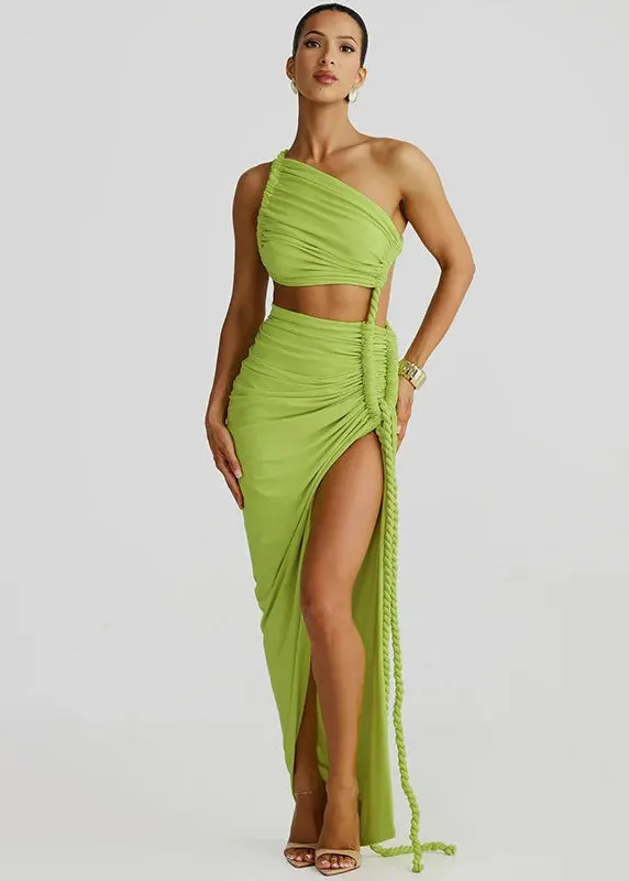 - Jupe fendue rehaussée d’un lien cordage stylisé