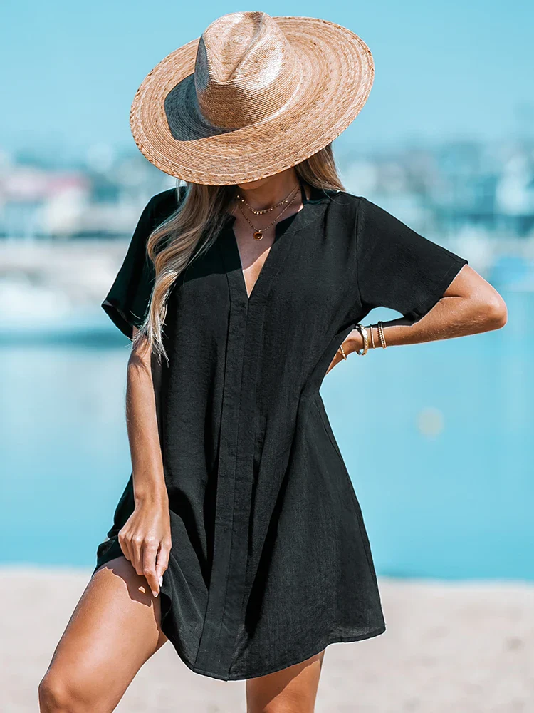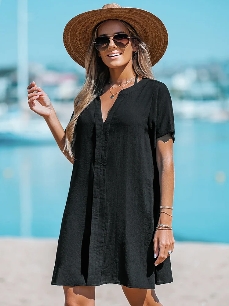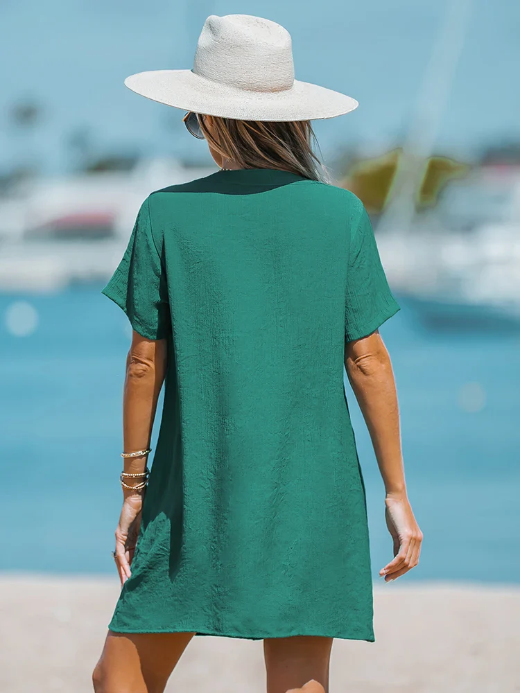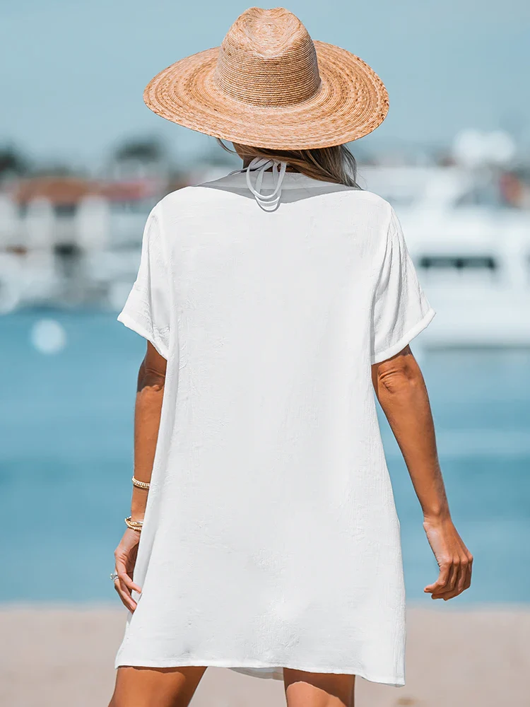 Découvrez notre tunique de plage boutonnée à manches courtes, idéale pour compléter votre look bikini avec style. Fabriquée dans un tissu léger et fluide, cette robe de plage vous offrira un confort optimal tout au long de la journée.