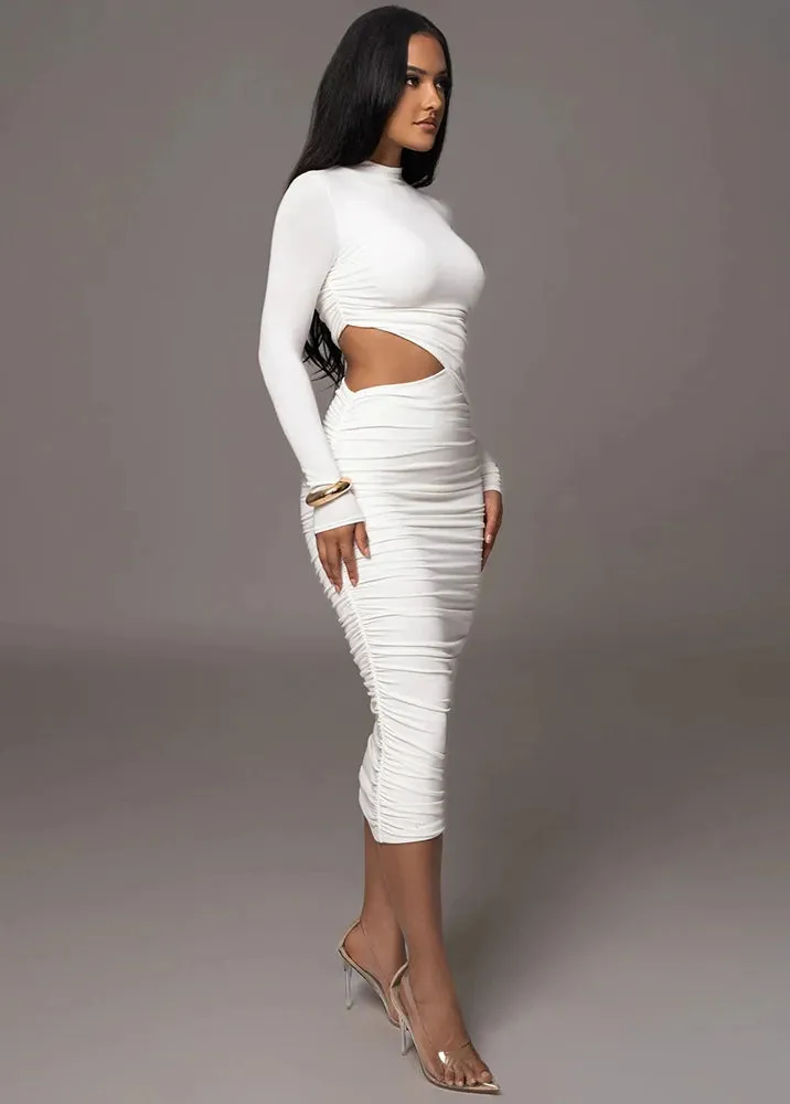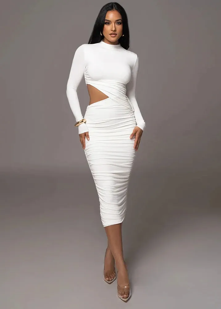 Affirmez votre style avec cette robe de soirée au design irrésistible, disponible en blanche ou noire pour s’adapter à toutes vos envies. Sa coupe moulante épouse parfaitement les courbes, mettant en valeur la silhouette avec élégance. Son col rond apporte une touche classique et raffinée, tandis que sa découpe à la hanche ajoute une note audacieuse et glamour. Avec sa longueur mi-longue, cette robe est idéale pour une allure chic et sophistiquée en toute occasion.