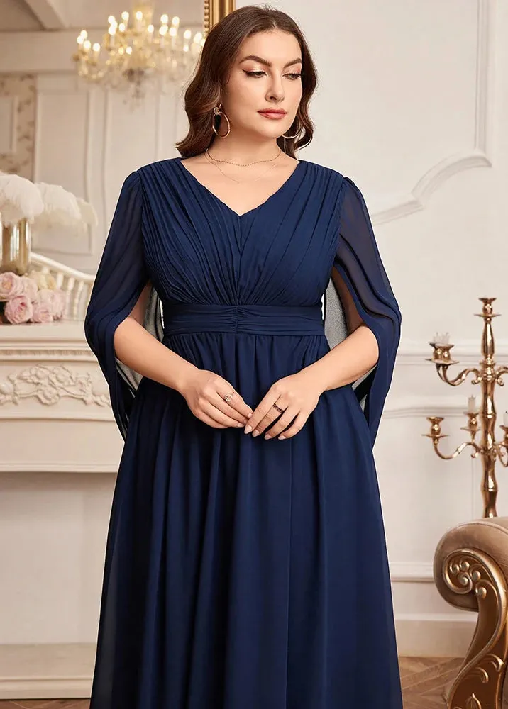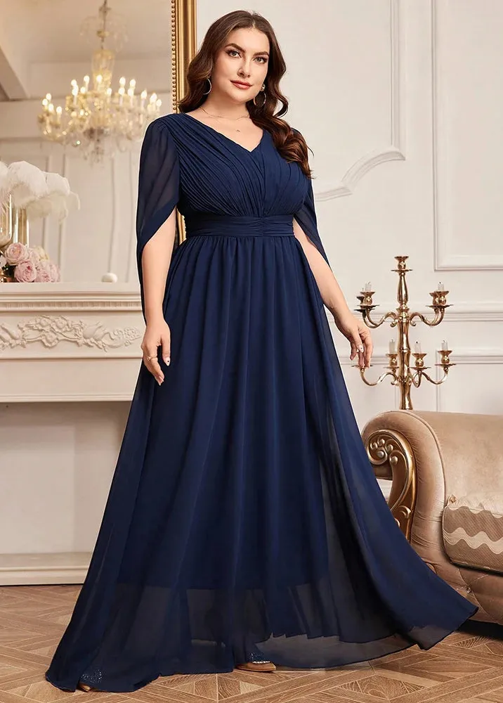 Éblouissez lors de vos événements les plus précieux avec cette somptueuse robe bleu marine spécialement conçue pour sublimer les silhouettes voluptueuses. Avec ses manches fluides et sa coupe empire flatteuse, elle apporte une touche de grâce et de raffinement incomparable.