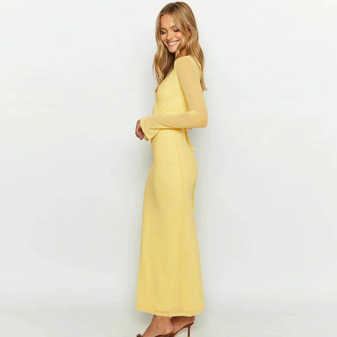 Associez cette robe à des sandales dorées et des bijoux fins pour un look lumineux et sophistiqué. Elle se porte aussi bien lors d’un dîner romantique que d’un événement chic en été. Laissez vos cheveux détachés pour un style bohème ou relevez-les pour une allure plus glamour.