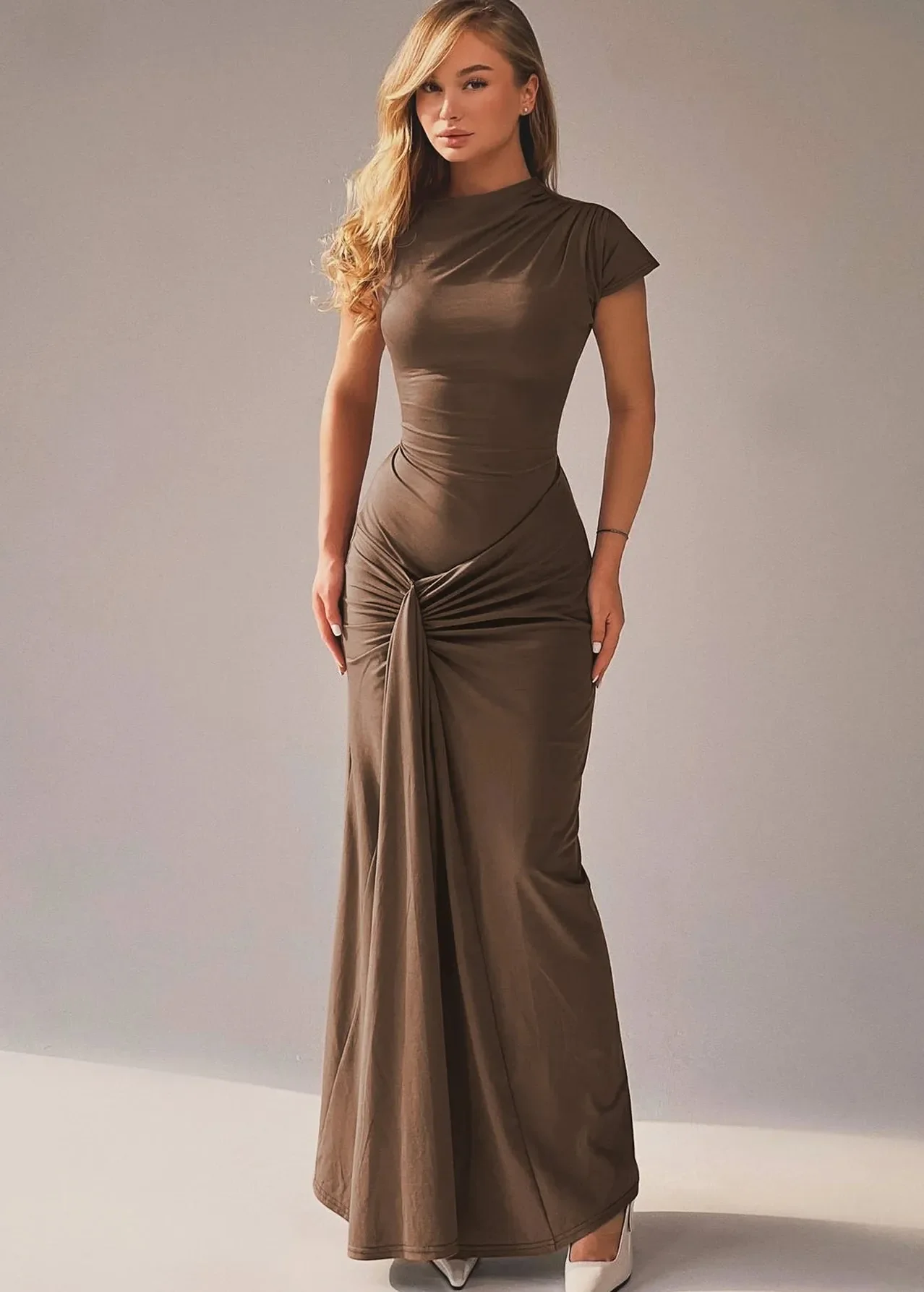 Affirmez votre style avec cette robe longue drapée, une pièce sophistiquée qui met en valeur chaque courbe avec subtilité. Son drapé au niveau des hanches sublime la silhouette en apportant du volume et du mouvement, tandis que son dos lacé ajoute une touche sensuelle et ajustable. Avec ses manches courtes et sa coupe fluide, elle est parfaite pour une allure chic et intemporelle. Disponible en rouge pour un effet glamour, en marron pour une élégance naturelle ou en noir pour un style sophistiqué, cette robe est idéale pour toutes les grandes occasions.