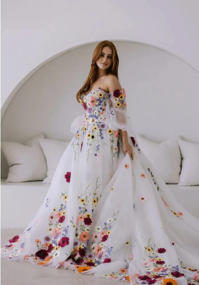 Détails : broderies florales multicolores, traîne élégante