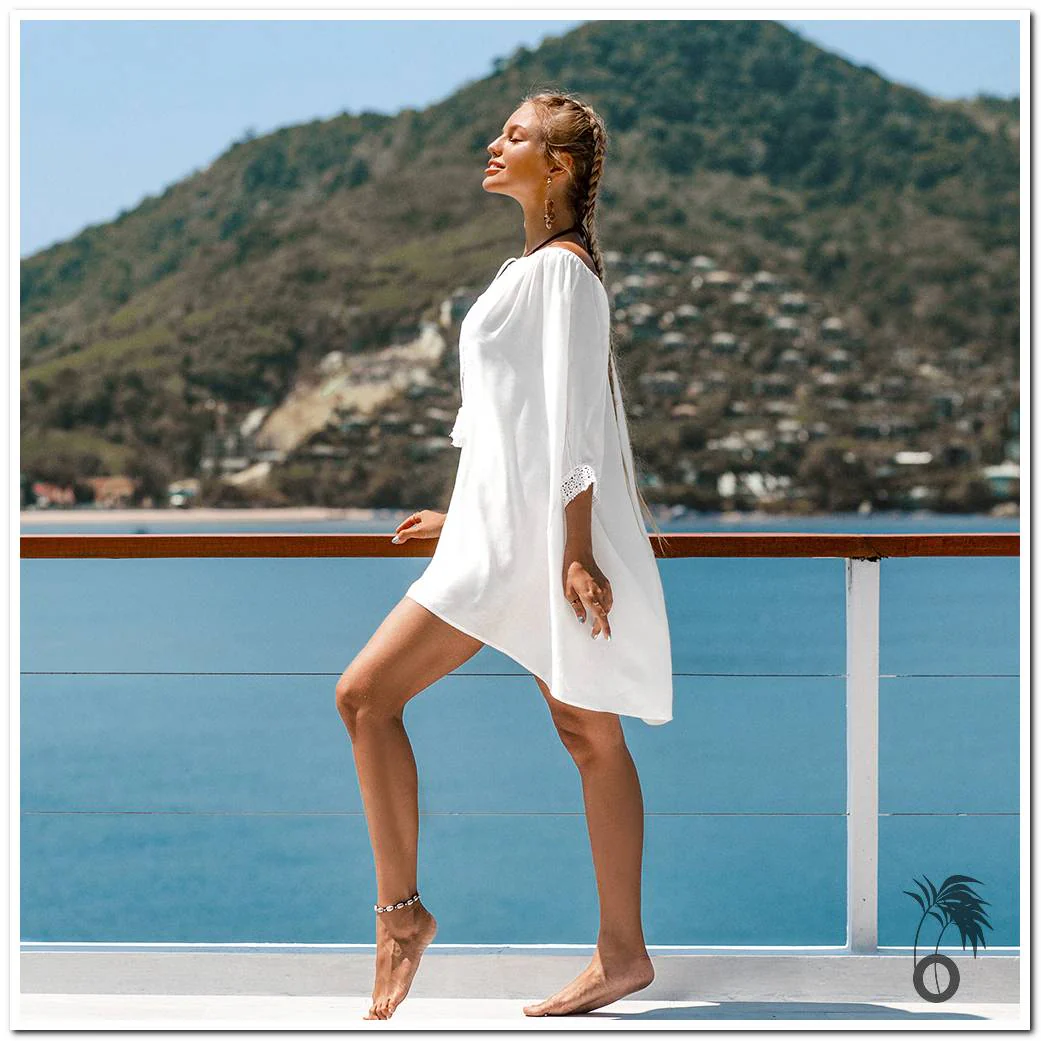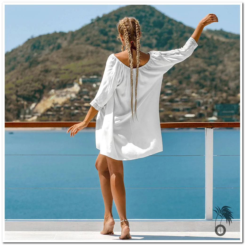 Blanche, large et courte avec des manches 3/4 délicieusement bordées de broderie, la robe plage blanche nous enveloppe avec grâce et délicatesse.