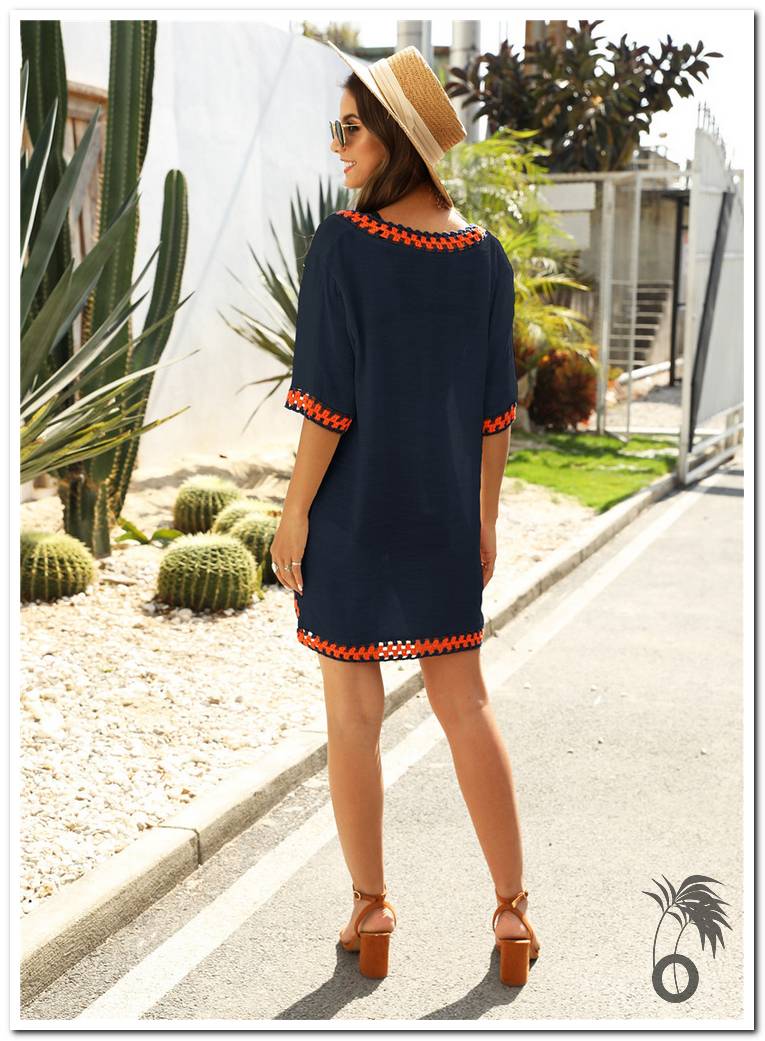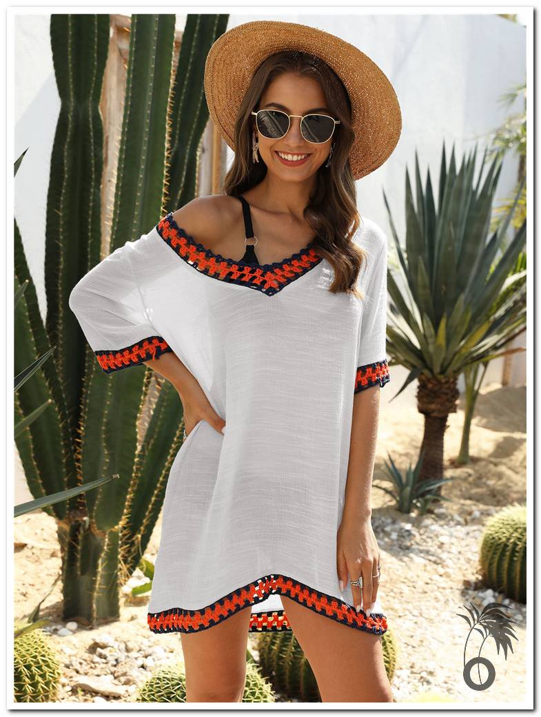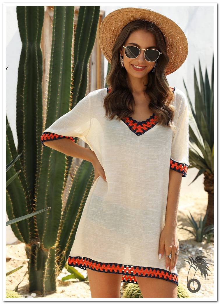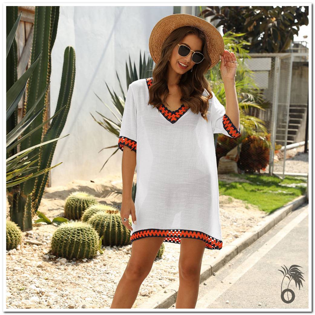 Avec leur tissu légèrement texturé, ces robes de plage femmes se distinguent par une bordure au col, aux manches et sur le bas de la robe qui est réalisée au crochet.