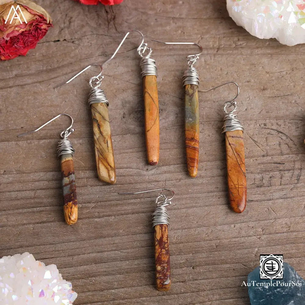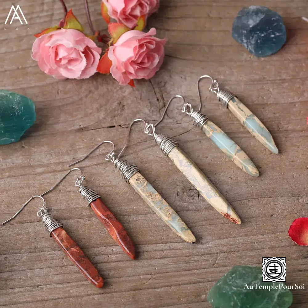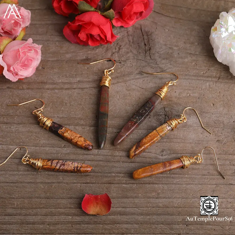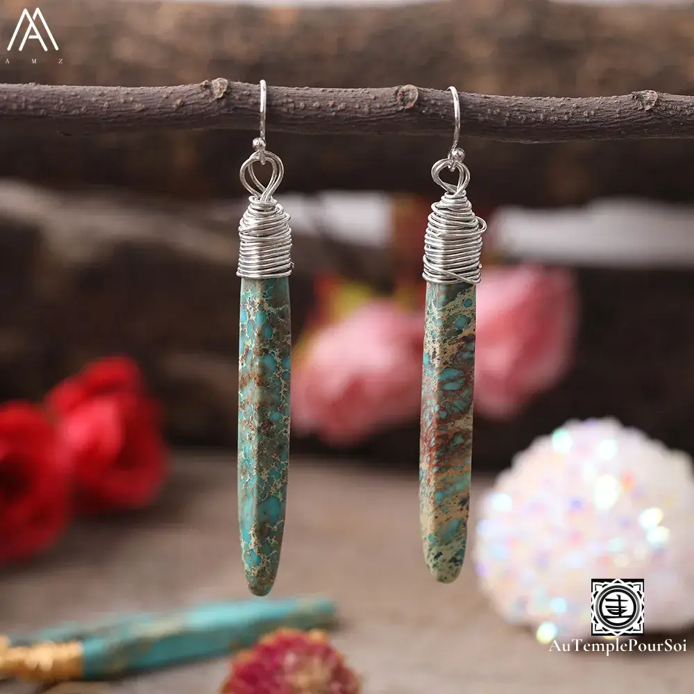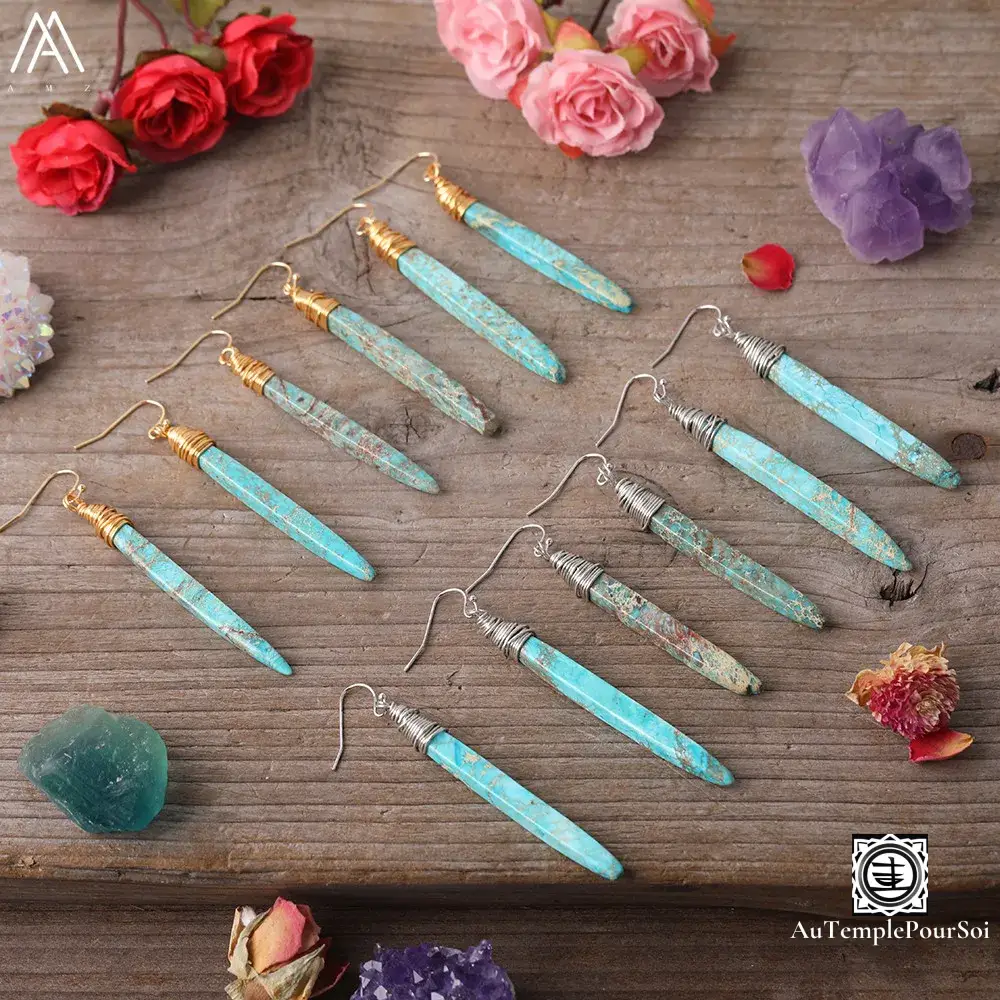 Chaque paire combine l’énergie vibrante du jaspe ou la tranquillité apaisante de la turquoise avec une touche d’or, créant ainsi un équilibre parfait entre éclat et élégance discrète. Les boucles d’oreilles pendantes, avec leur forme allongée et leur enroulement doré, sont conçues pour capturer la lumière et attirer l’œil, offrant une présence à la fois audacieuse et sereine.