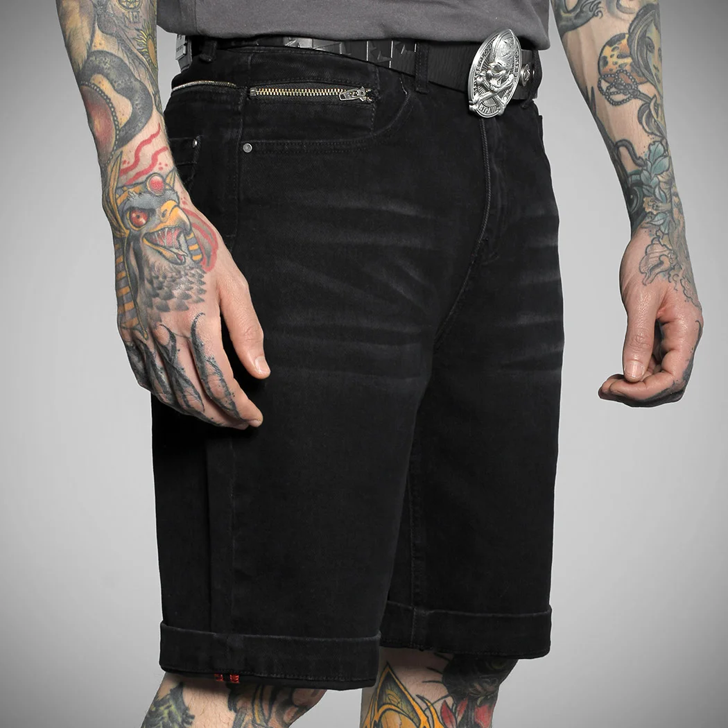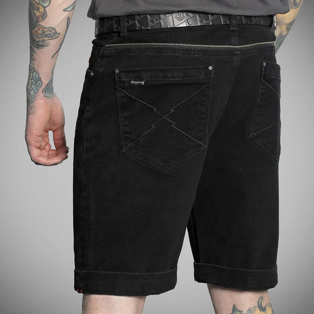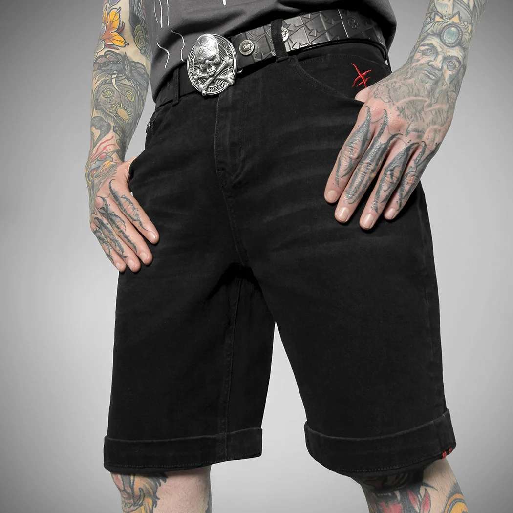 Collection ÉTÉ 2025 – Short en jean noir avec bouton et fermeture zippée en métal. Logo signature « Hyraw Cross » brodé en rouge sur la poche gauche. Broderie noire « Lightnings » sur les poches arrières, motif en as de pique imprimé sur les sacs des poches avant. Demi-zip fantaisie au-dessus des poches arrière. Jacron métallique patché en forme de lame de rasoir siglée au dos. Coutures intérieures rouge.