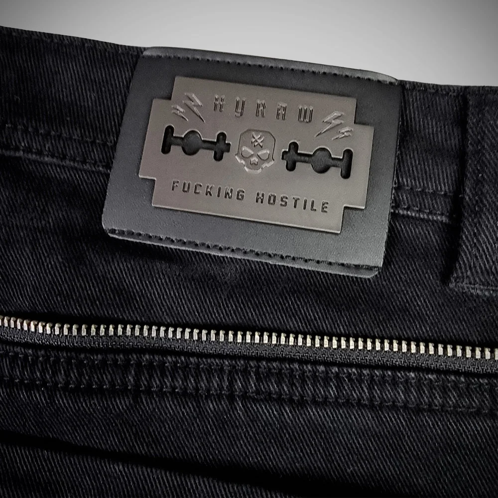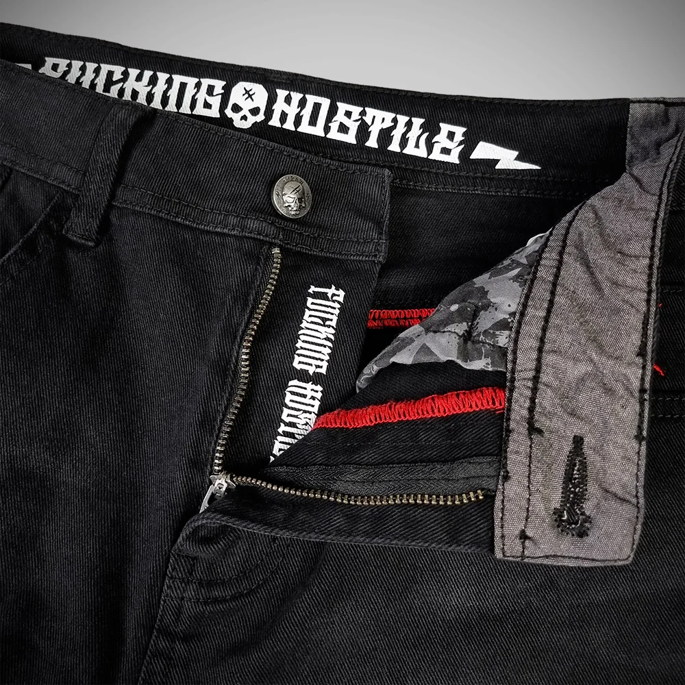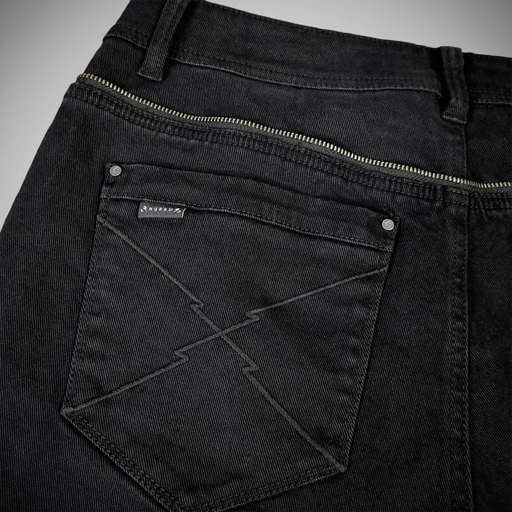 Collection ÉTÉ 2025 – Short en jean noir avec bouton et fermeture zippée en métal. Logo signature « Hyraw Cross » brodé en rouge sur la poche gauche. Broderie noire « Lightnings » sur les poches arrières, motif en as de pique imprimé sur les sacs des poches avant. Demi-zip fantaisie au-dessus des poches arrière. Jacron métallique patché en forme de lame de rasoir siglée au dos. Coutures intérieures rouge.