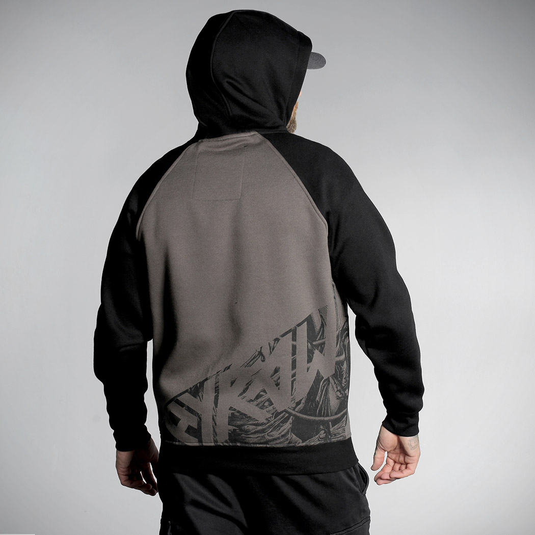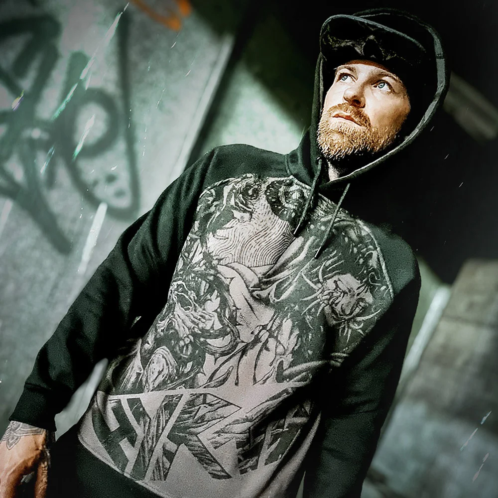 Collection AUTOMNE 2024 – Sweat à capuche raglan noir et gris, avec impression du visuel EYES TRIP sur la face avant en allover, sur le bas à l’arrière et à l’intérieur de la capuche. Dessin original de Marcos Riviera – Artwork by Hyraw Design. Idéal pour celles et ceux qui aiment le confort autant que la musique lourde et torturée.