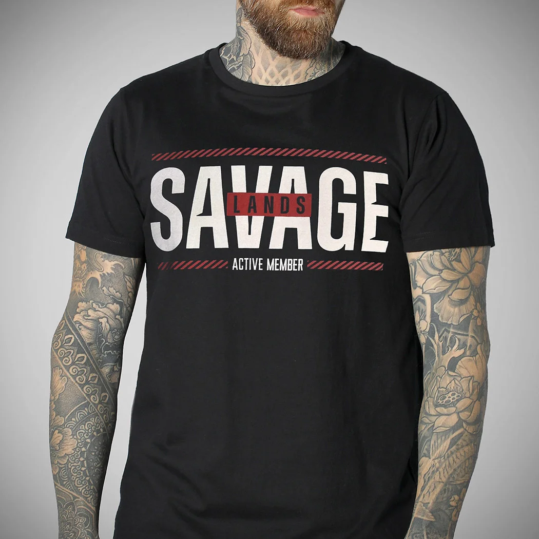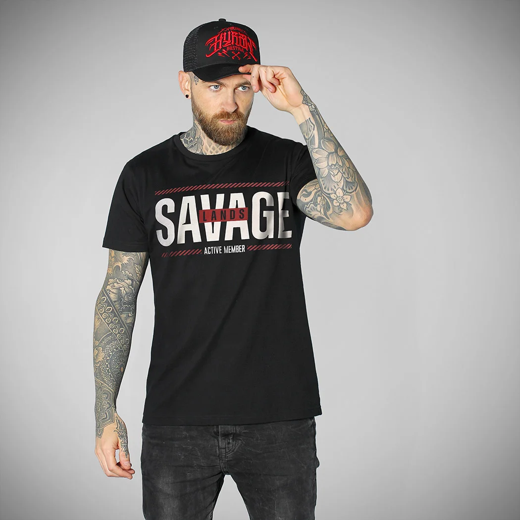 T-shirt noir avec impression du logo SAVAGE LANDS – ACTIVE MEMBER en blanc et rouge sur le devant. Cobranding SAVAGE LANDS X HYRAW. T-shirt imprimé en France. Pour en savoir plus sur le partenariat entre SAVAGE LANDS & Hyraw, aller sur la page : Co-branding SAVAGE LANDS