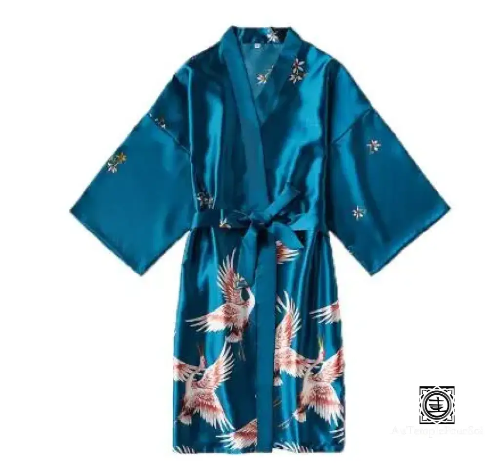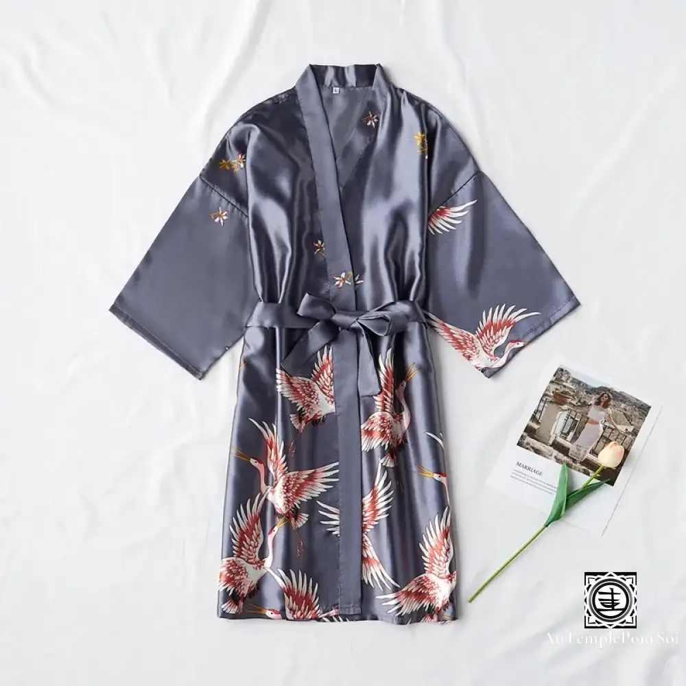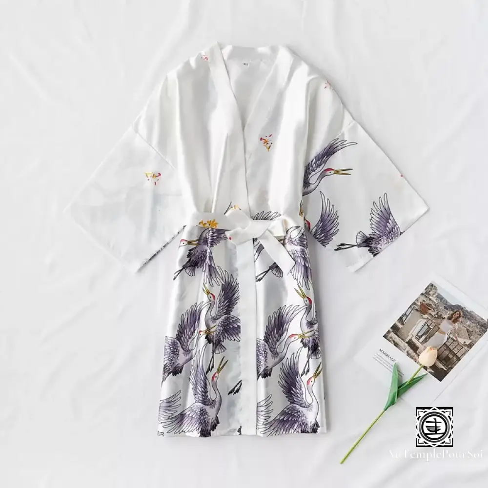 Ce vêtement de nuit illustre un mariage parfait entre élégance et confort. Les motifs de grues en vol ajoutent une touche d’exotisme et de délicatesse, évoquant l’art traditionnel japonais. La soie, matière noble et douce, promet une sensation de légèreté et de bien-être tout au long de la nuit. Idéale pour les instants de détente à la maison ou lors de vos soirées intimes, cette robe de chambre ajoute une touche d’élégance à vos moments de repos. Disponible en tailles variées pour s’adapter à chaque silhouette, elle est conçue pour celles qui cherchent à allier style et confort en toute occasion.