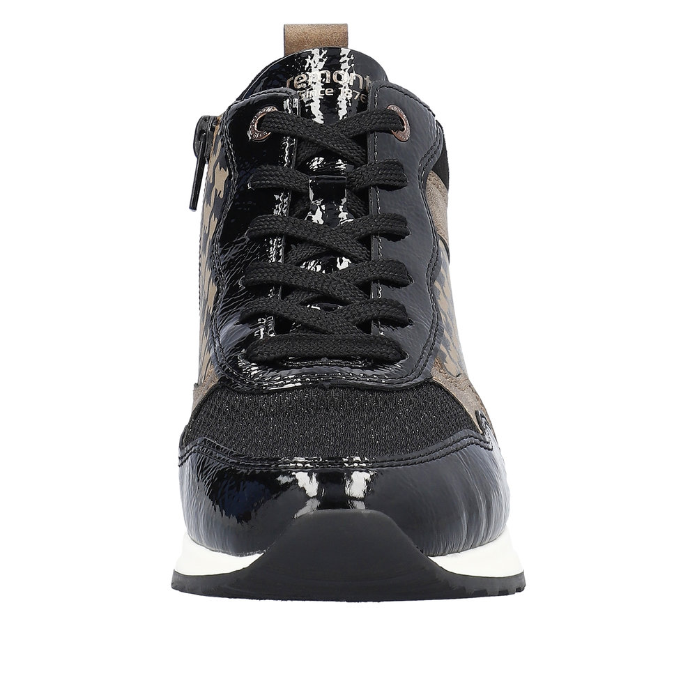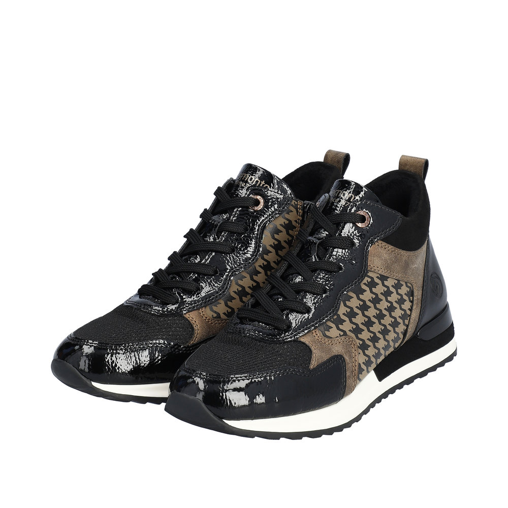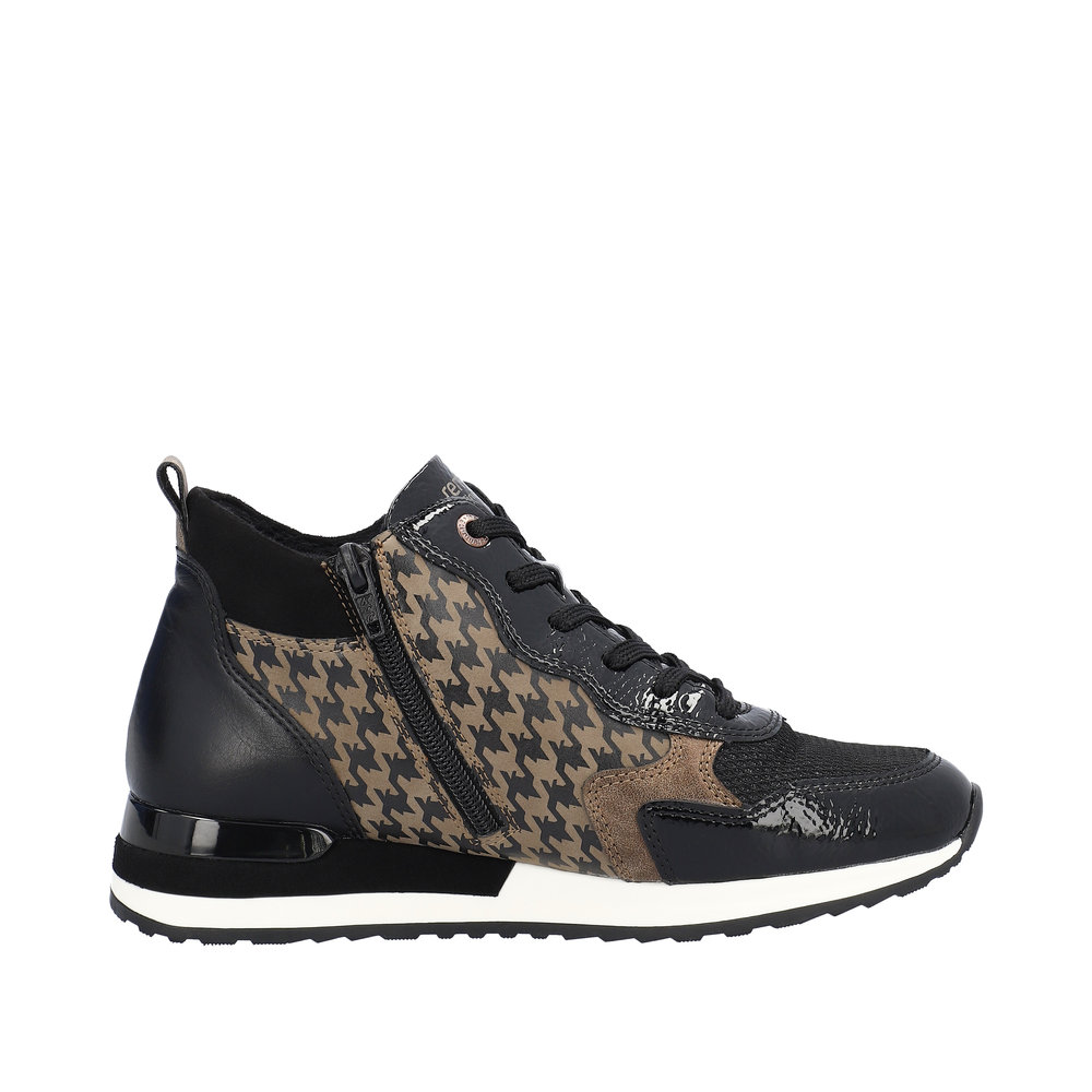 Avec sa coupe glamour, la nouvelle sneaker femme REMONTE enchante. Le dessus est en faux cuir souple et le chaussant est élargi pour s’adapter à toutes les morphologies. L’intérieur est en molleton afin de garder les pieds bien au chaud. La semelle intérieure de ces bottines possède une voûte plantaire pour amortir les chocs. Cette semelle amovible, peut être remplacée par une semelle orthopédique pour un soutien personnalisé. Côté style la semelle extérieure est souligné d’un galon clair mettant en valeur le vernis noir, le dessus à paillettes ainsi que l’empiècement à effet pied de poule de ces boots au look très féminin. La lacet permet un ajustement de la largeur tandis que la fermeture éclair sur le côté intérieur de la chaussure facilite l’enfilage.