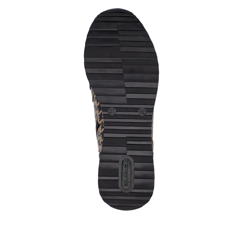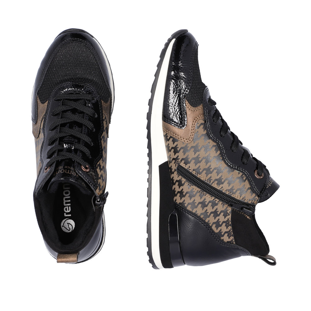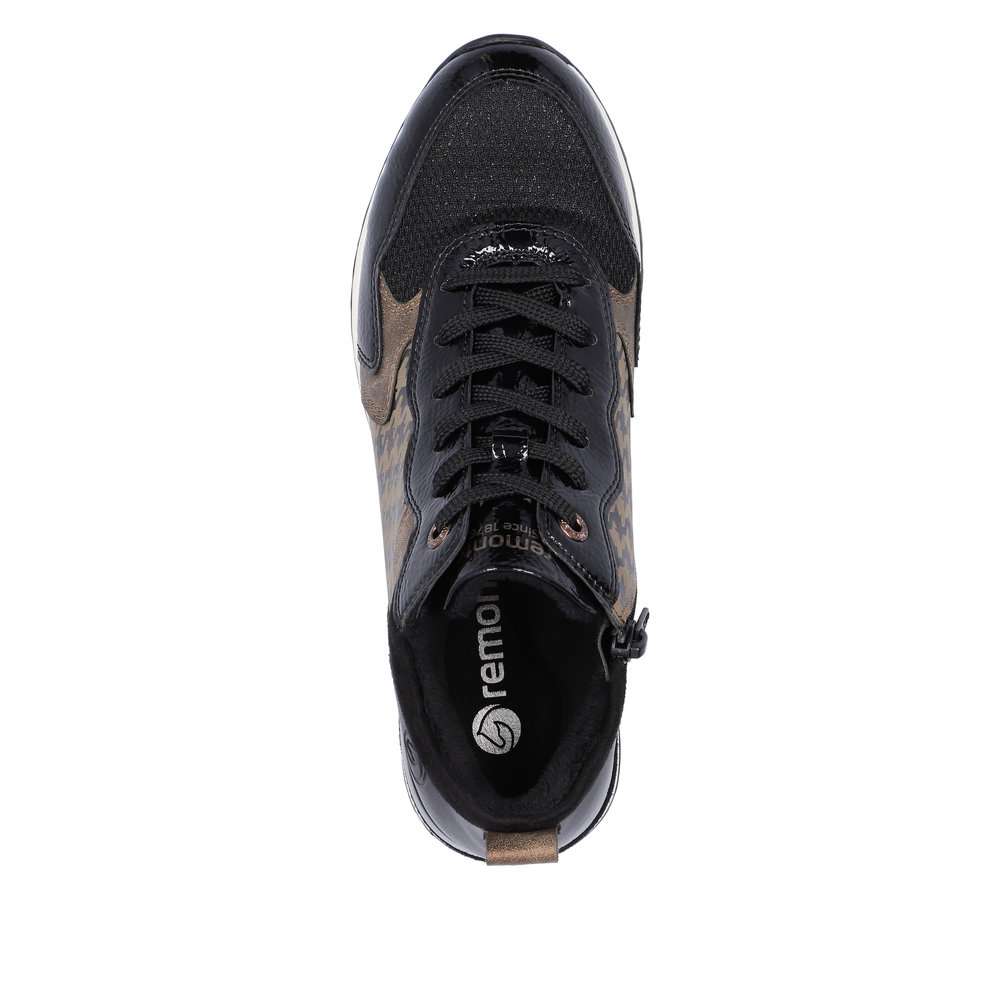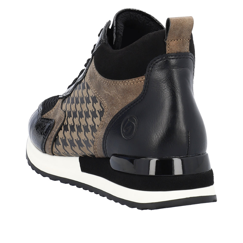 Avec sa coupe glamour, la nouvelle sneaker femme REMONTE enchante. Le dessus est en faux cuir souple et le chaussant est élargi pour s’adapter à toutes les morphologies. L’intérieur est en molleton afin de garder les pieds bien au chaud. La semelle intérieure de ces bottines possède une voûte plantaire pour amortir les chocs. Cette semelle amovible, peut être remplacée par une semelle orthopédique pour un soutien personnalisé. Côté style la semelle extérieure est souligné d’un galon clair mettant en valeur le vernis noir, le dessus à paillettes ainsi que l’empiècement à effet pied de poule de ces boots au look très féminin. La lacet permet un ajustement de la largeur tandis que la fermeture éclair sur le côté intérieur de la chaussure facilite l’enfilage.