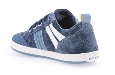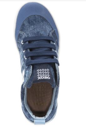 Baskets garçon de la marque GEOX en toile bleu jeans ou bleu et orange. Semelle intérieure amovible et respirante en cuir, semelle extérieure en caoutchouc. La languette est pourvue d’élastiques sur les côtés afin de pouvoir porter ces chaussures sans lacets. Bout recouvert de caoutchouc pour une meilleure résistance à l’usure.